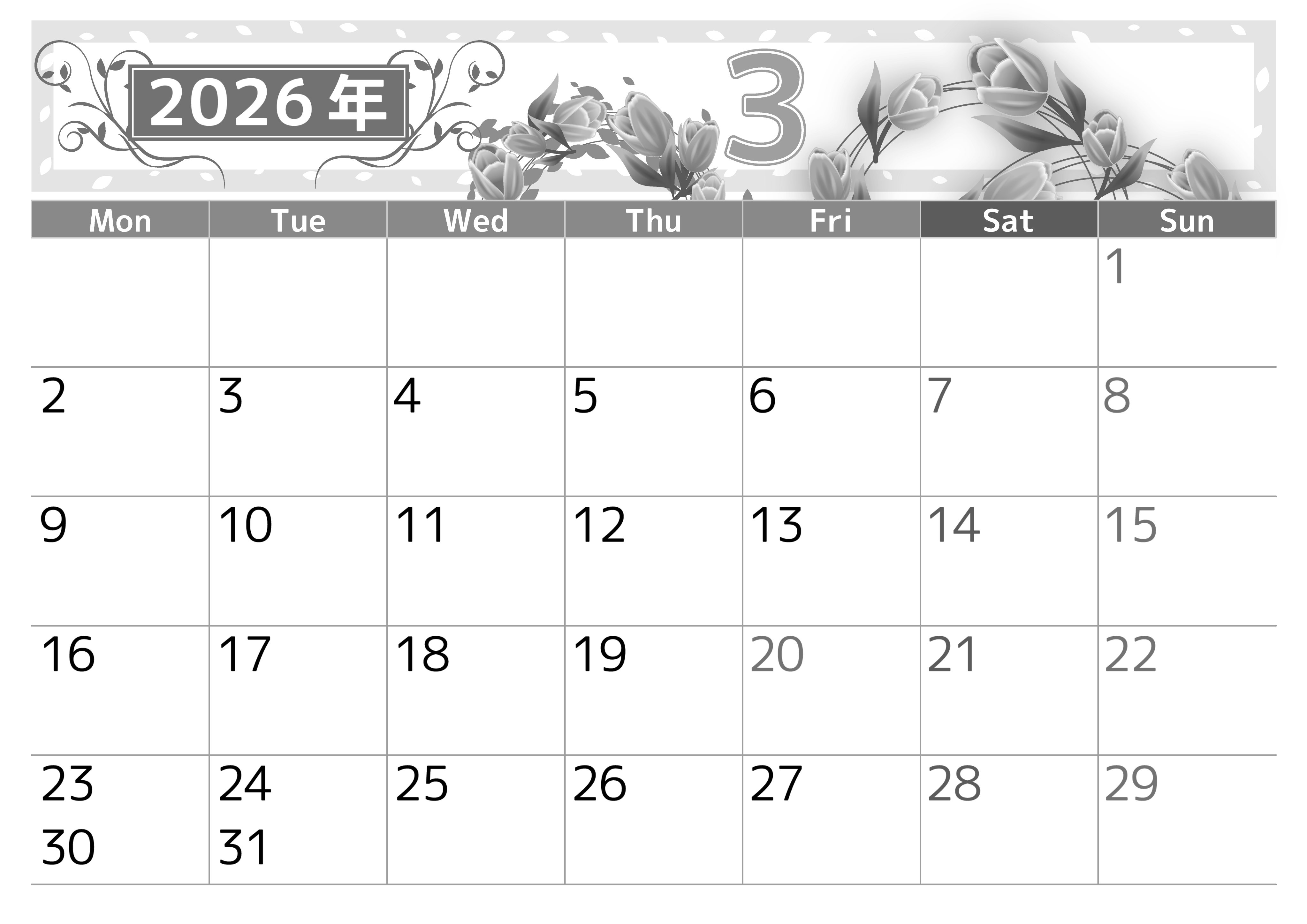 2026年3月横型モノクロの月曜始まりの無料テンプレート白黒カレンダーです。チューリップに春の訪れを感じさせられるようなおしゃれで落ち着いたイラストがあしらわれている白黒カレンダーとなっています。(2026-00500301)