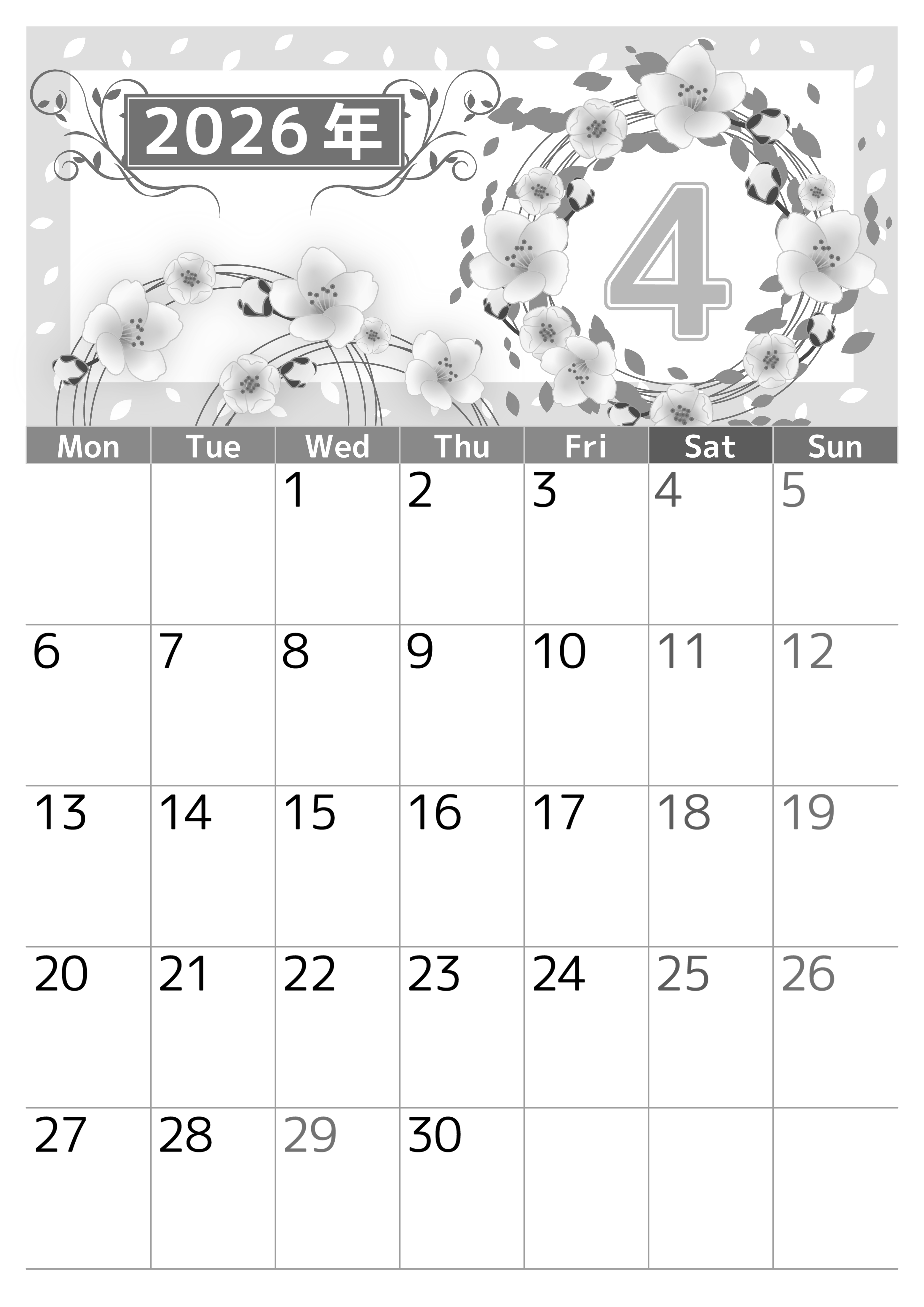 2026年・無料のカレンダーテンプレート 2026年4月縦型モノクロの月曜始まり 桜イラストのおしゃれA4無料白黒カレンダー(2026-00500411) 素材状デザイン王 2025年4月1日 2026年4月縦型モノクロの月曜始まりの無料テンプレート白黒カレンダーです。気取っていない素朴でおしゃれな印象を与える桜のイラストです。白黒カレンダー部分は罫線がはっきりと引かれています。(2026-00500411) 4月 縦型のカレンダー 月曜始まり 白黒 カレンダーデザイン-0050