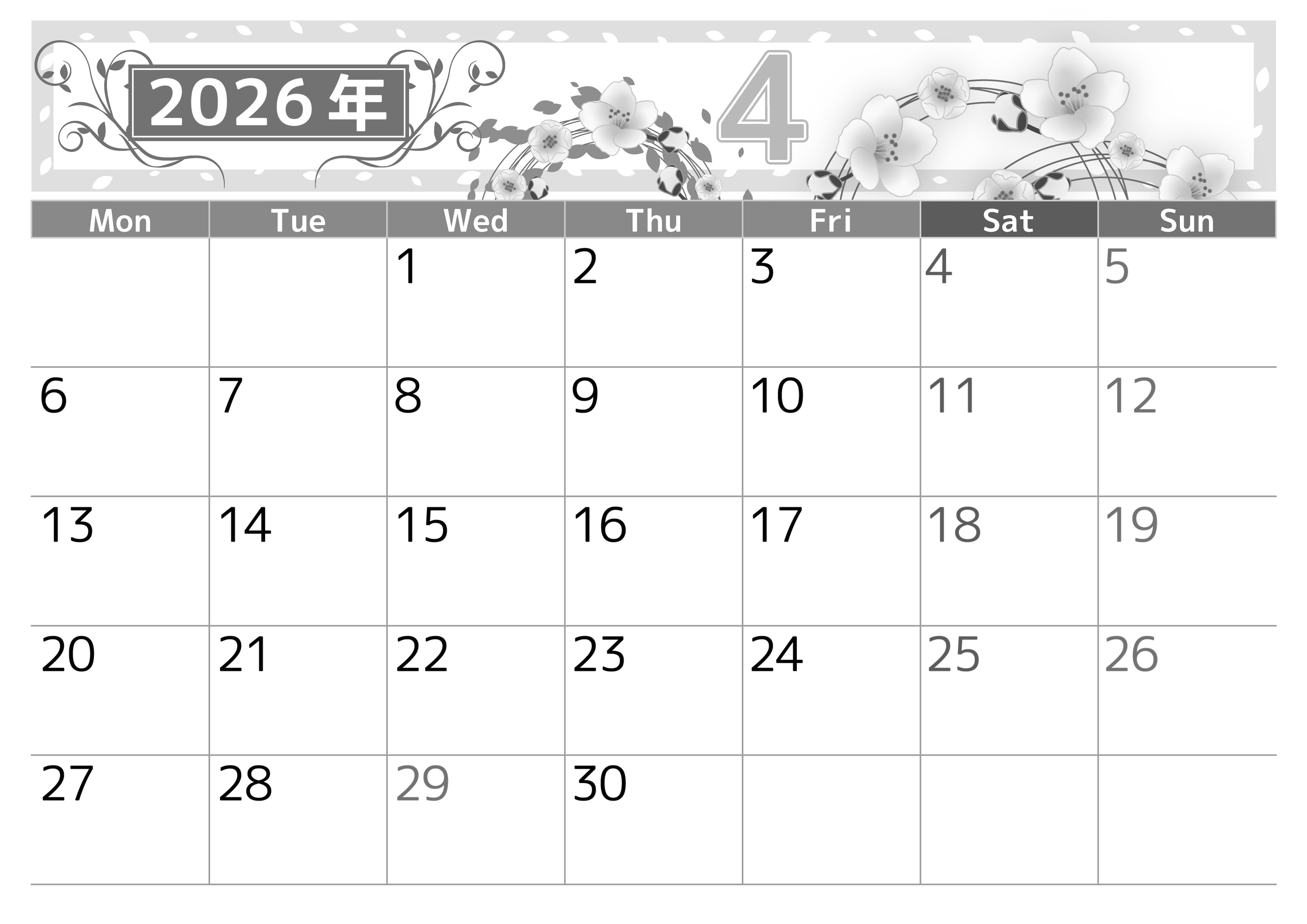 2026年4月横型モノクロの月曜始まりの無料テンプレート白黒カレンダーです。春の儚さを思わせる桜の一種であるソメイヨシノのイラストがおしゃれな白黒カレンダーです。文字フォントは丸ゴシックなのでとても見やすいです。(2026-00500401)