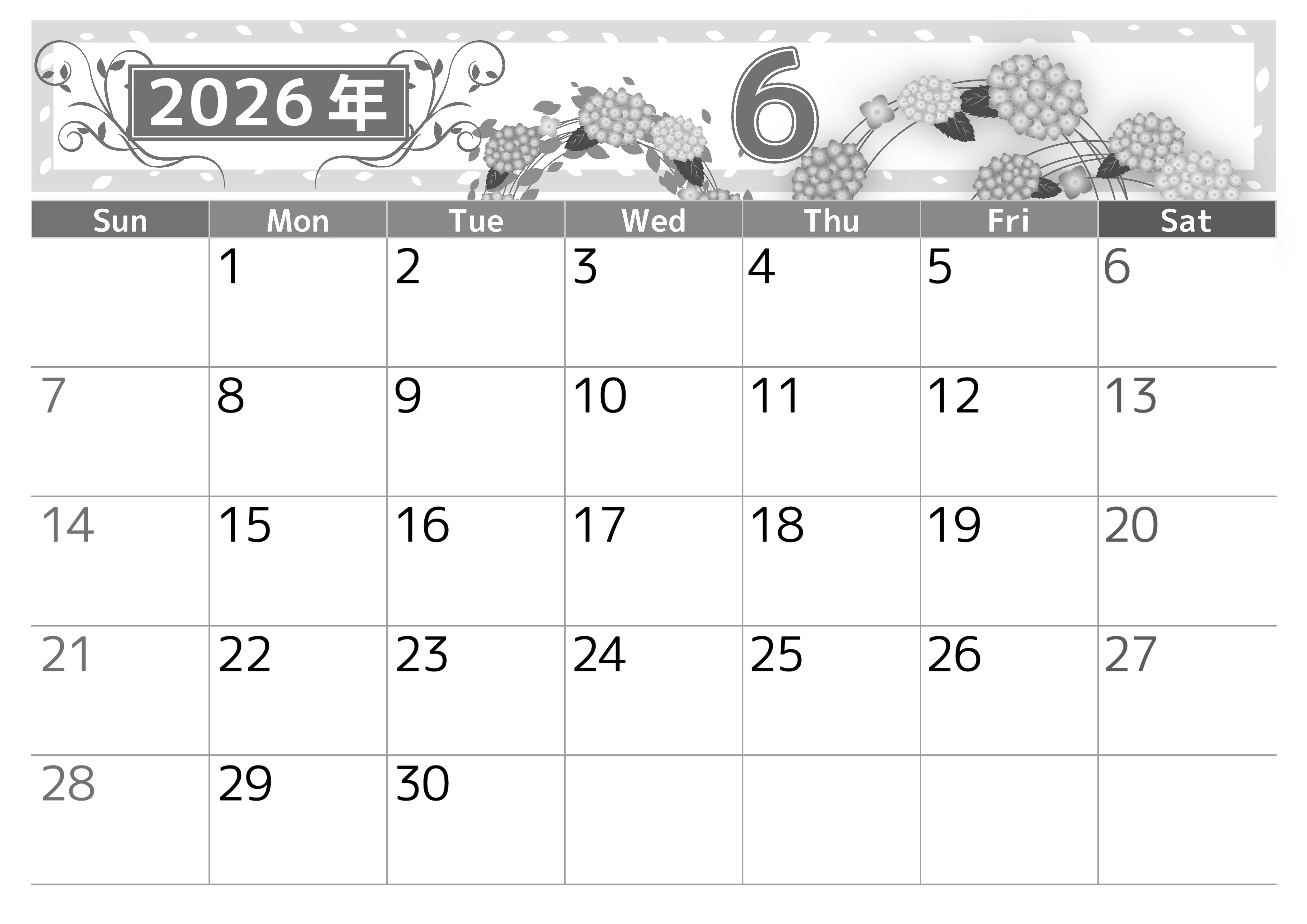 2026年6月横型モノクロの日曜始まりの無料テンプレート白黒カレンダーです。紫陽花のイラスト部分はシックで大人のおしゃれさが漂っています。プランニングがしやすい実用性に長けた白黒カレンダーです。(2026-00500600)