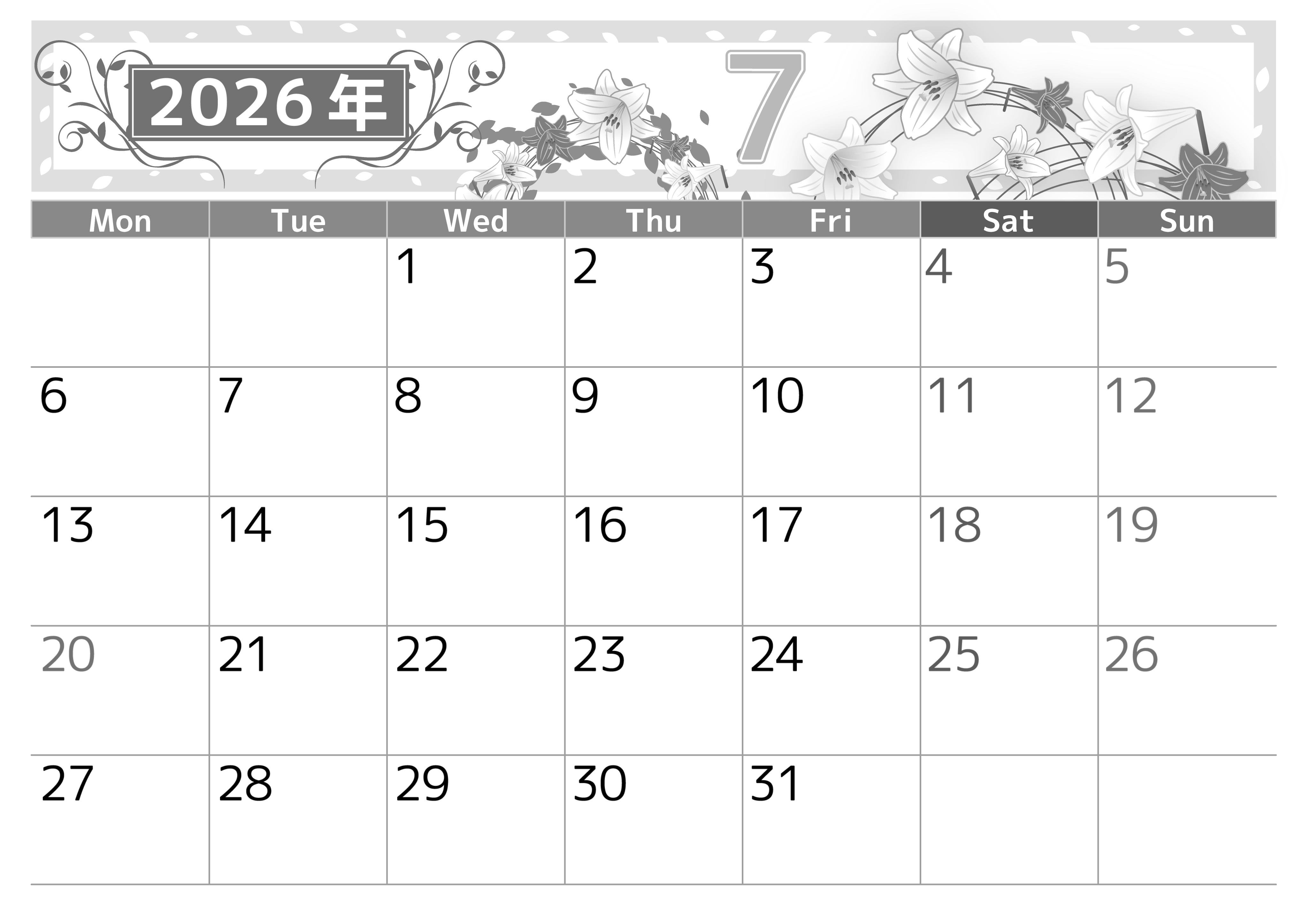 2026年・無料のカレンダーテンプレート 2026年7月横型モノクロの月曜始まり 百合イラストのおしゃれA4無料白黒カレンダー(2026-00500701) 素材状デザイン王 2025年4月1日 2026年7月横型モノクロの月曜始まりの無料テンプレート白黒カレンダーです。百合のイラストが美しくおしゃれな月曜始まりで様々なタスクの書き込みがしやすい白黒カレンダーとなっています。(2026-00500701) 7月 横型のカレンダー 月曜始まり 白黒 カレンダーデザイン-0050