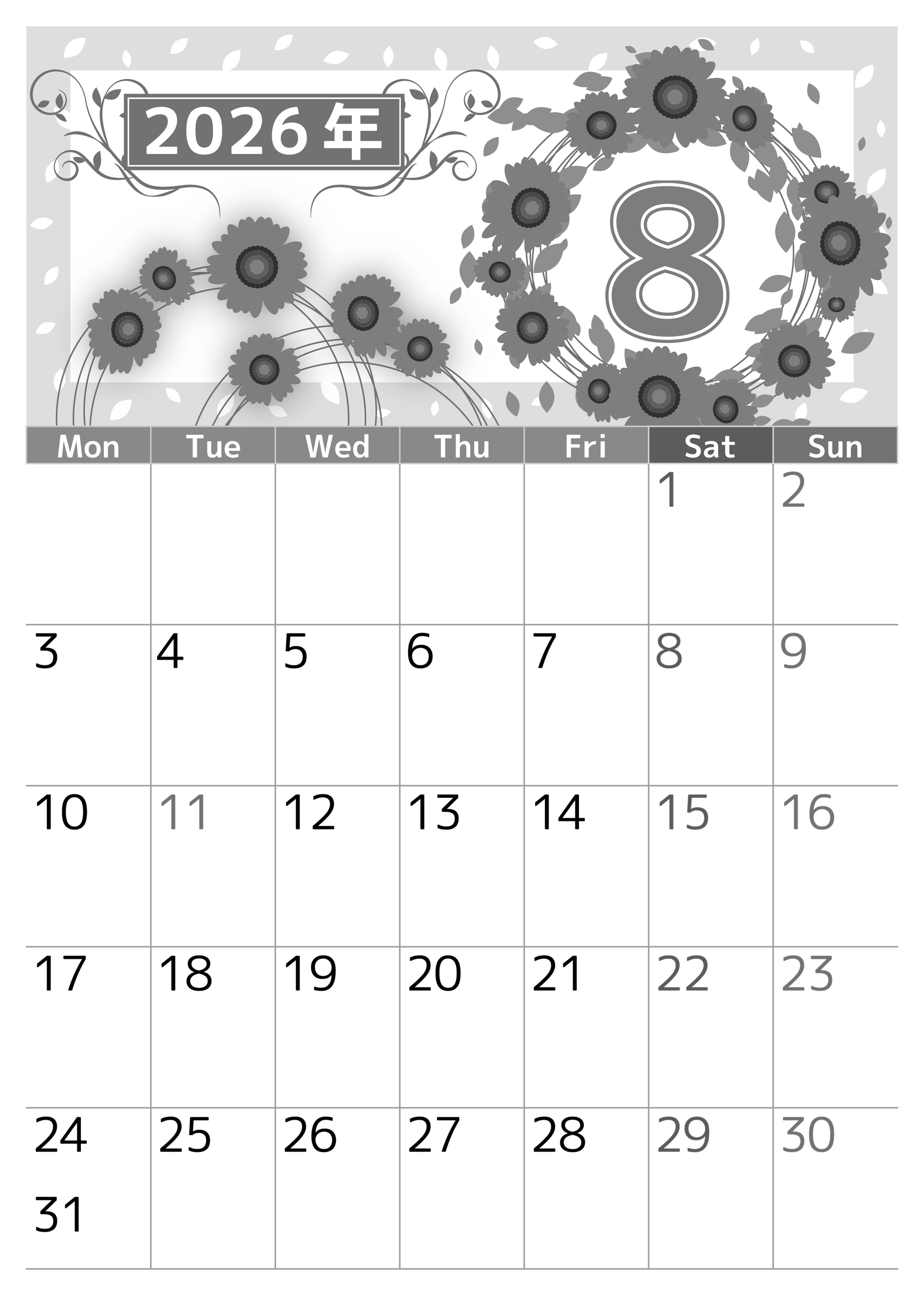 2026年8月縦型モノクロの月曜始まりの無料テンプレート白黒カレンダーです。ヒマワリの花と茎のコントラストが元気いっぱいでありながらも大人っぽいおしゃれさを漂わせているイラストがおすすめの要素です。(2026-00500811)