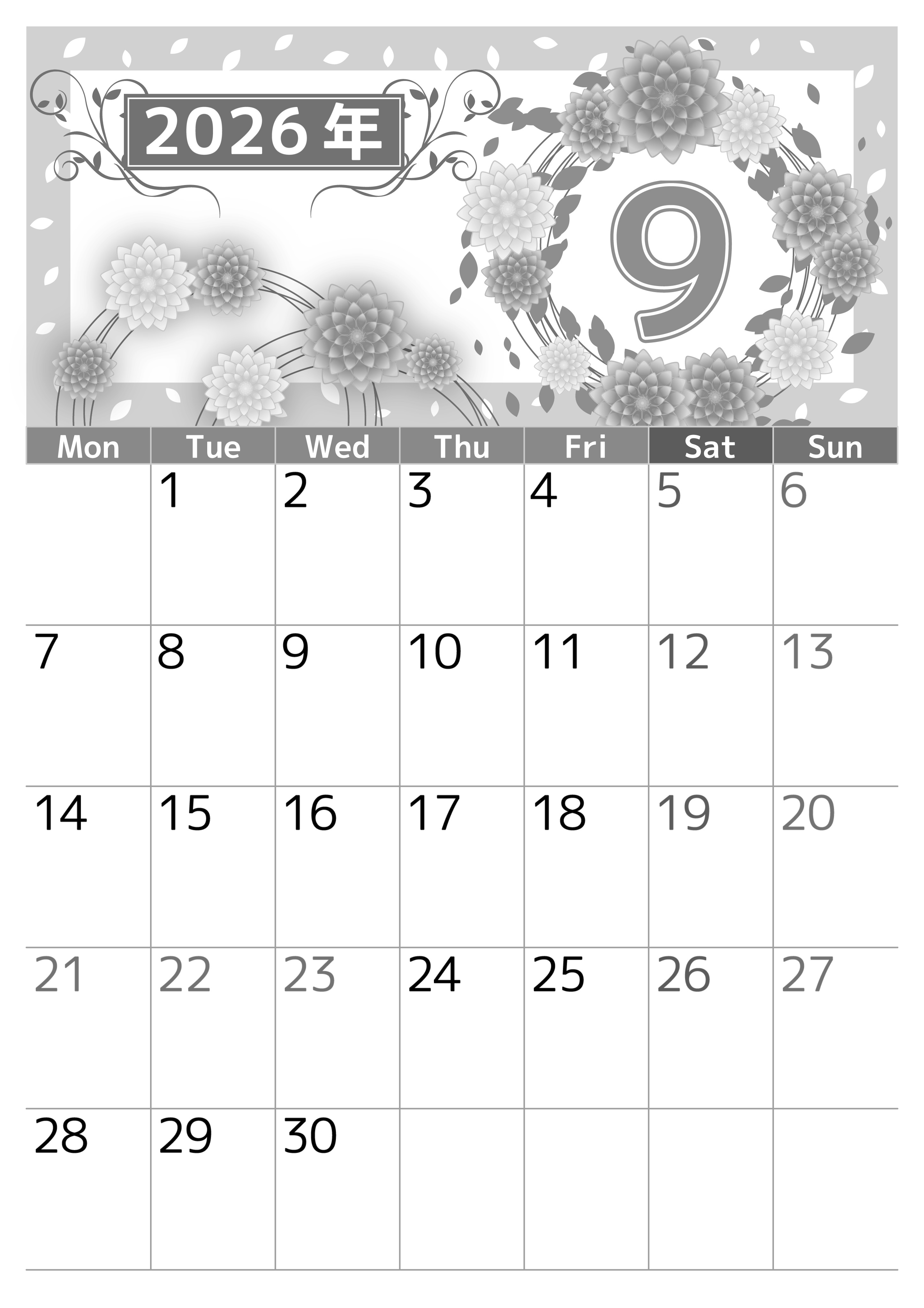 2026年9月縦型モノクロの月曜始まり マリーゴールドイラストのおしゃれA4無料白黒カレンダー(2026-00500911)
