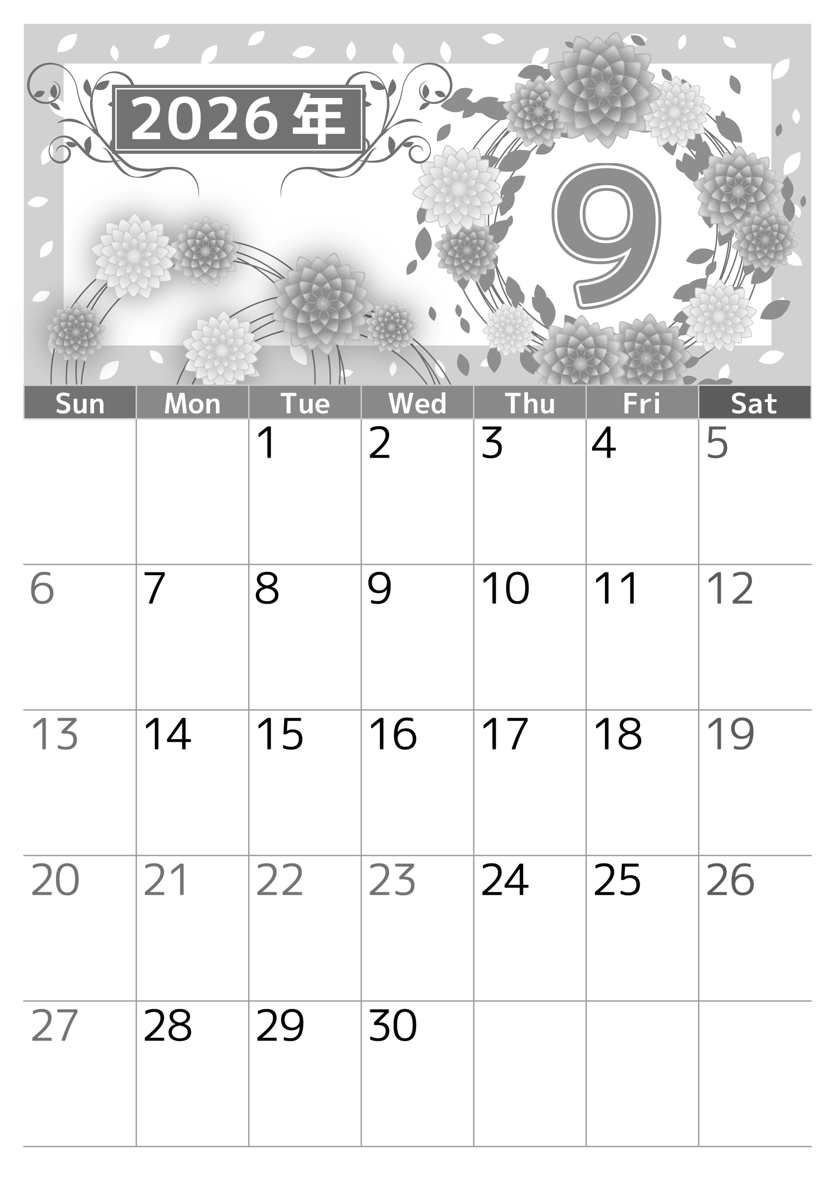 2026年9月縦型モノクロの日曜始まりの無料テンプレート白黒カレンダーです。秋が始まり少しずつ寒くなる季節に温かさを添えてくれるような温かいイラストがおしゃれでしっとりとしている白黒カレンダーです。(2026-00500910)