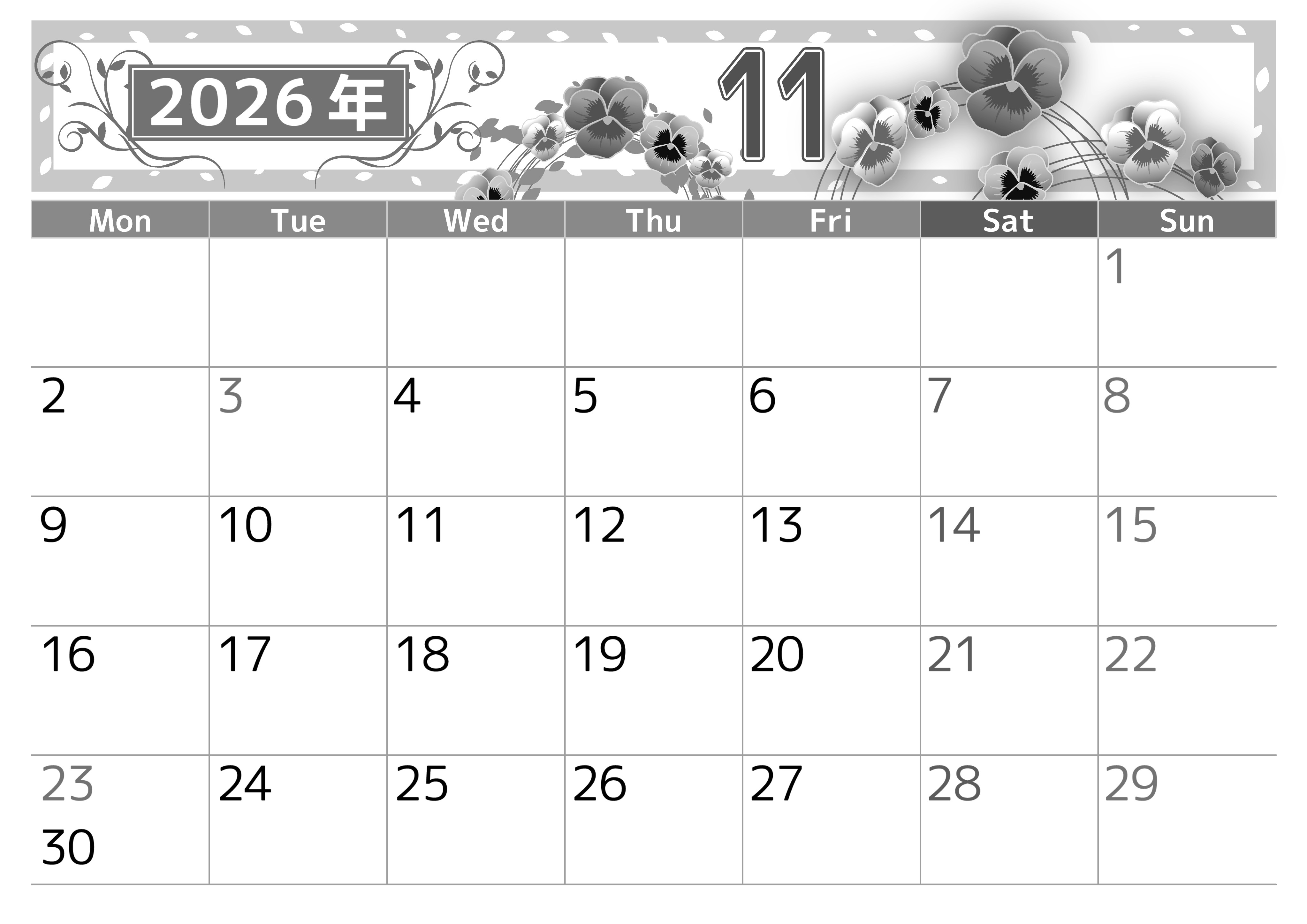 2026年11月横型モノクロの月曜始まり パンジーイラストのおしゃれA4無料白黒カレンダー(2026-00501101)