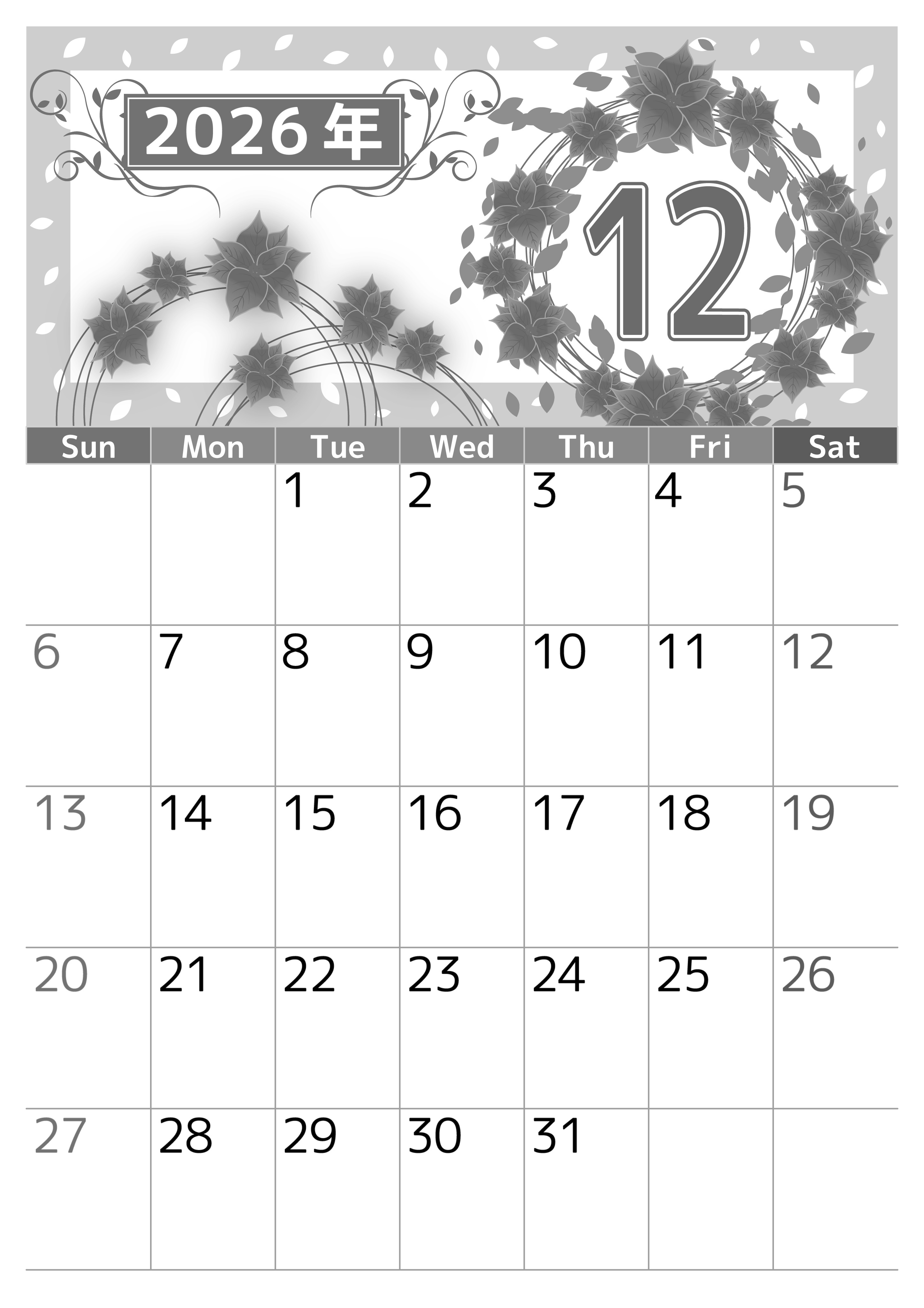 2026年12月縦型モノクロの日曜始まりの無料テンプレート白黒カレンダーです。クリスマスといえばポインセチア。イラストがおしゃれなだけでなく白黒カレンダー部分も罫線がはっきりとしているので見やすい実用性が高い無料コンテンツです。(2026-00501210)