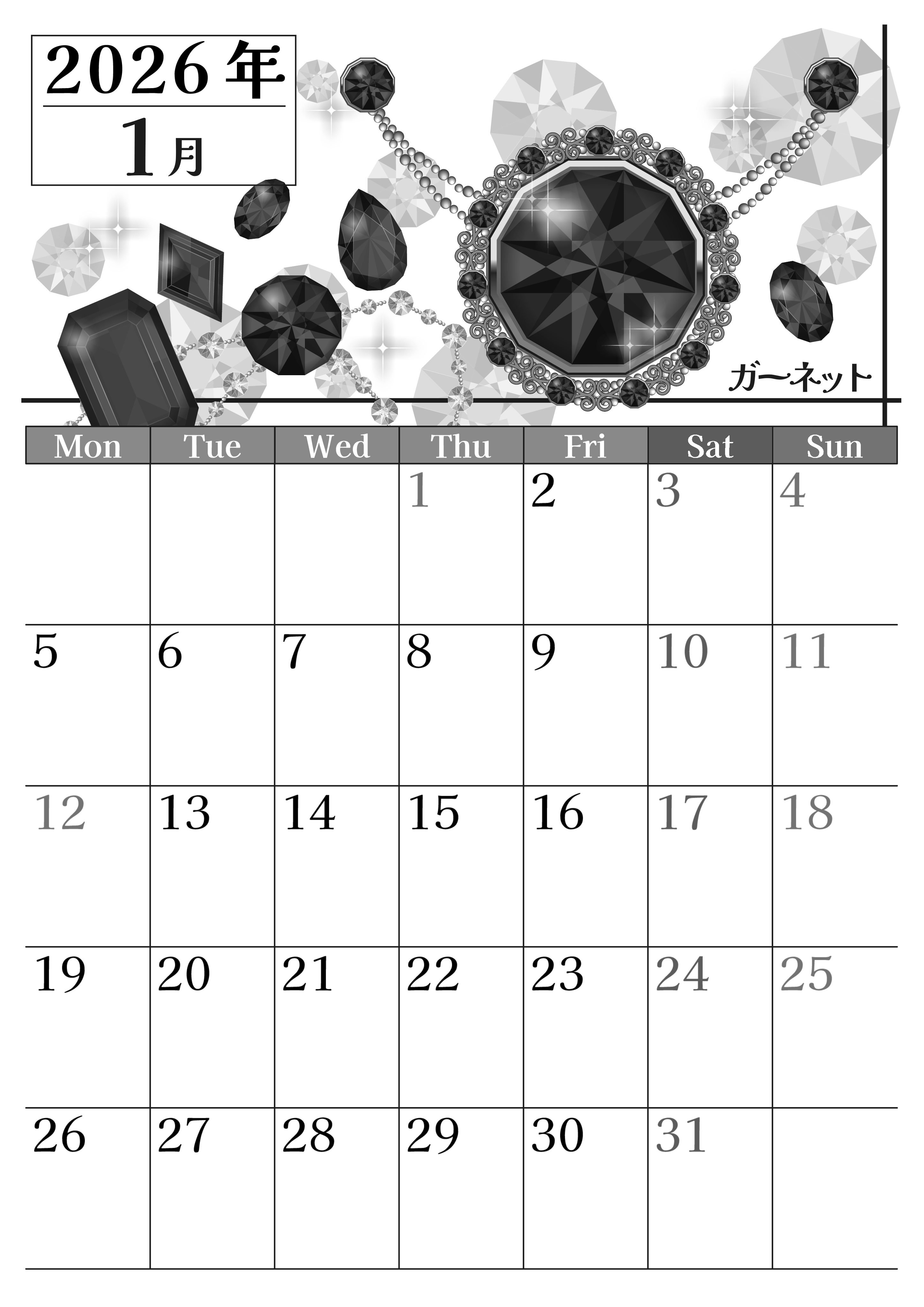 2026年1月縦型モノクロの月曜始まりの無料テンプレート白黒カレンダーです。ガーネットは赤い宝石で1月の誕生石にあたります。おしゃれで輝いている女性に特におすすめをしたいイラスト白黒カレンダーとなっています。(2026-00510111)