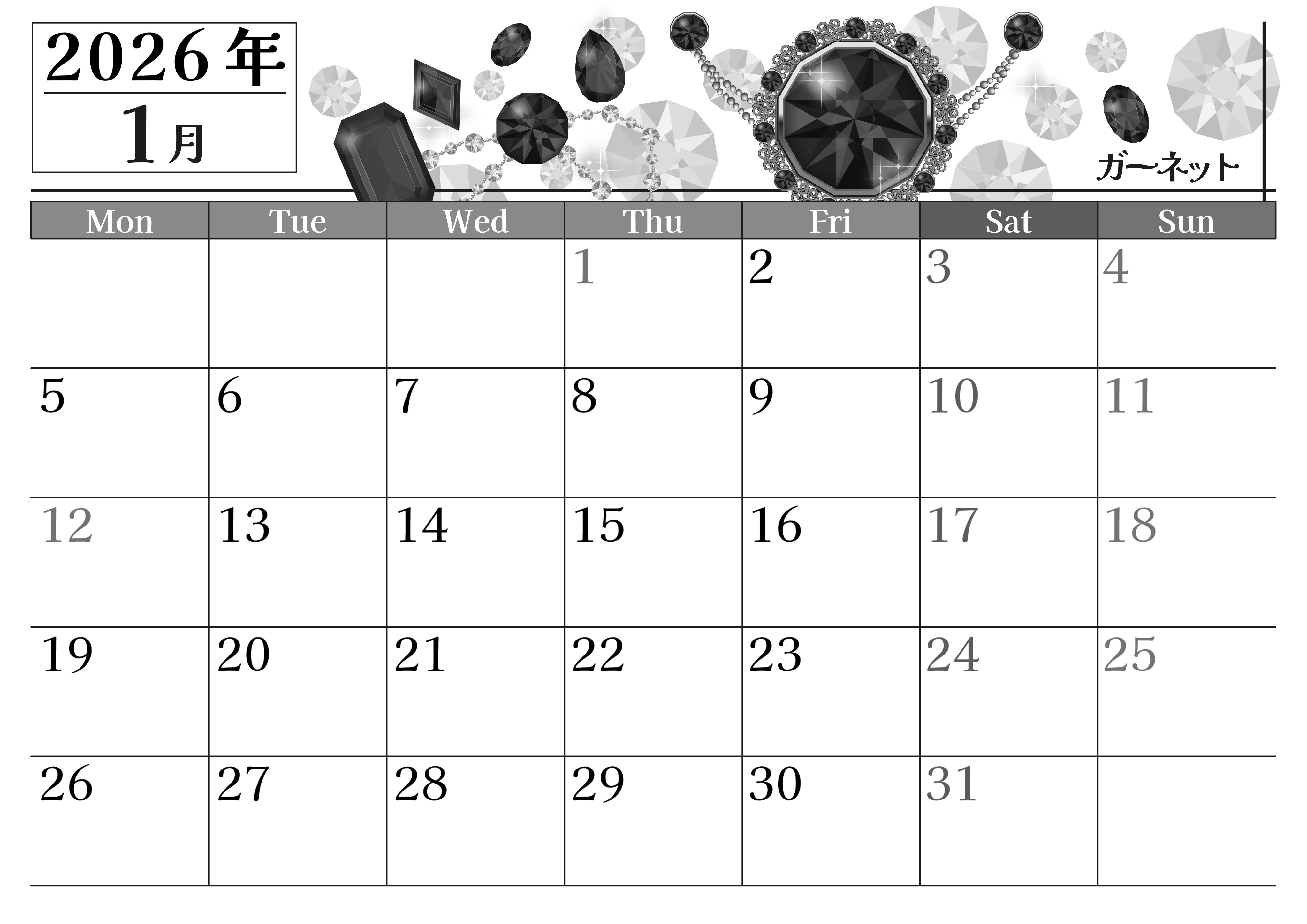 2026年・無料のカレンダーテンプレート 2026年1月横型モノクロの月曜始まり 誕生石イラストのおしゃれA4無料白黒カレンダー(2026-00510101) 素材状デザイン王 2025年4月1日 2026年1月横型モノクロの月曜始まりの無料テンプレート白黒カレンダーです。1月の誕生石であるガーネットを取り上げている豪華でラグジュアリーな使っていて贅沢な気持ちになるフリー素材です。(2026-00510101) 1月 横型のカレンダー 月曜始まり 白黒 カレンダーデザイン-0051