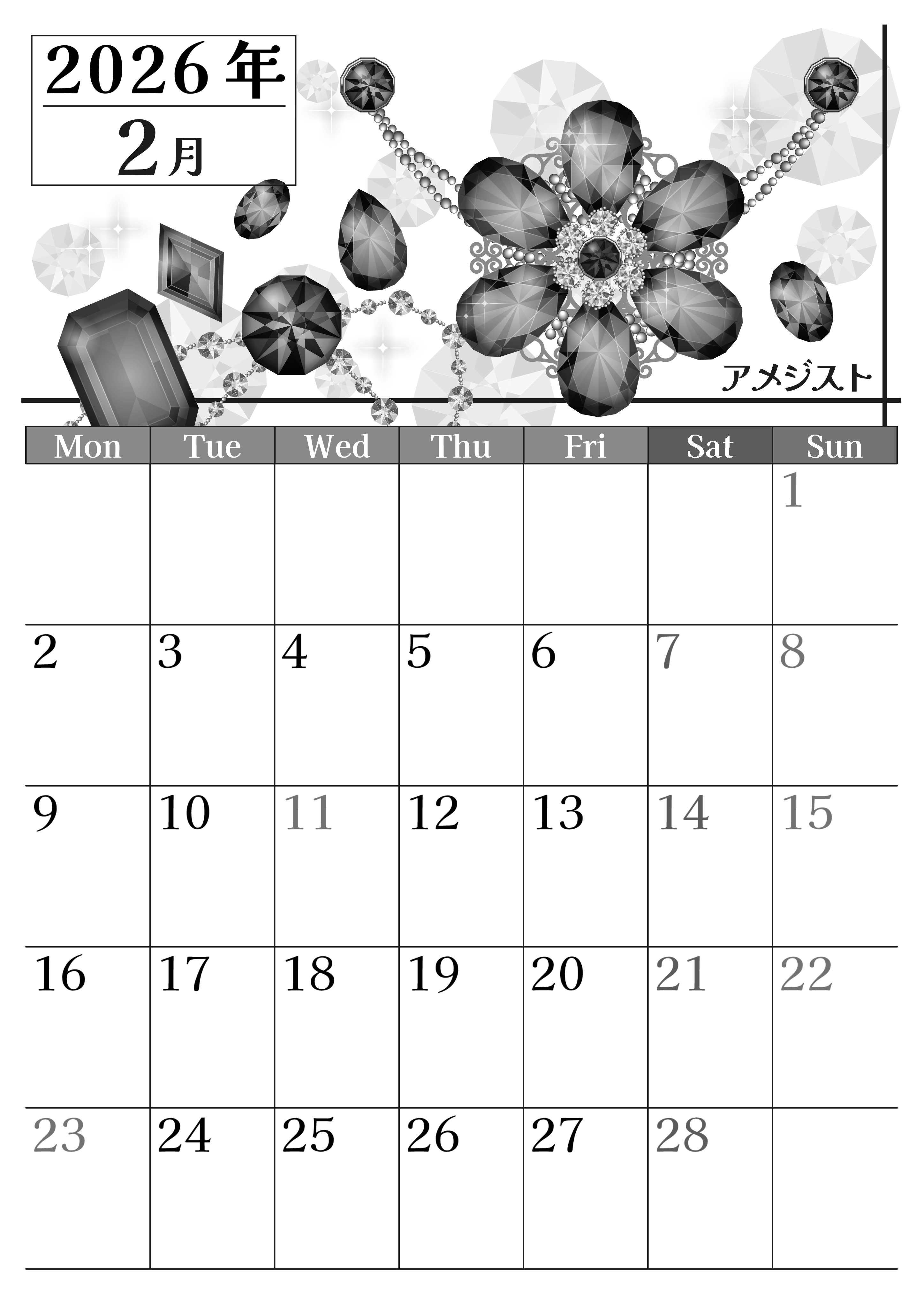 2026年2月縦型モノクロの月曜始まりの無料テンプレート白黒カレンダーです。アメジストは紫の宝石で2月の誕生石にあたります。おしゃれで輝いている女性に特におすすめをしたいイラスト白黒カレンダーとなっています。(2026-00510211)