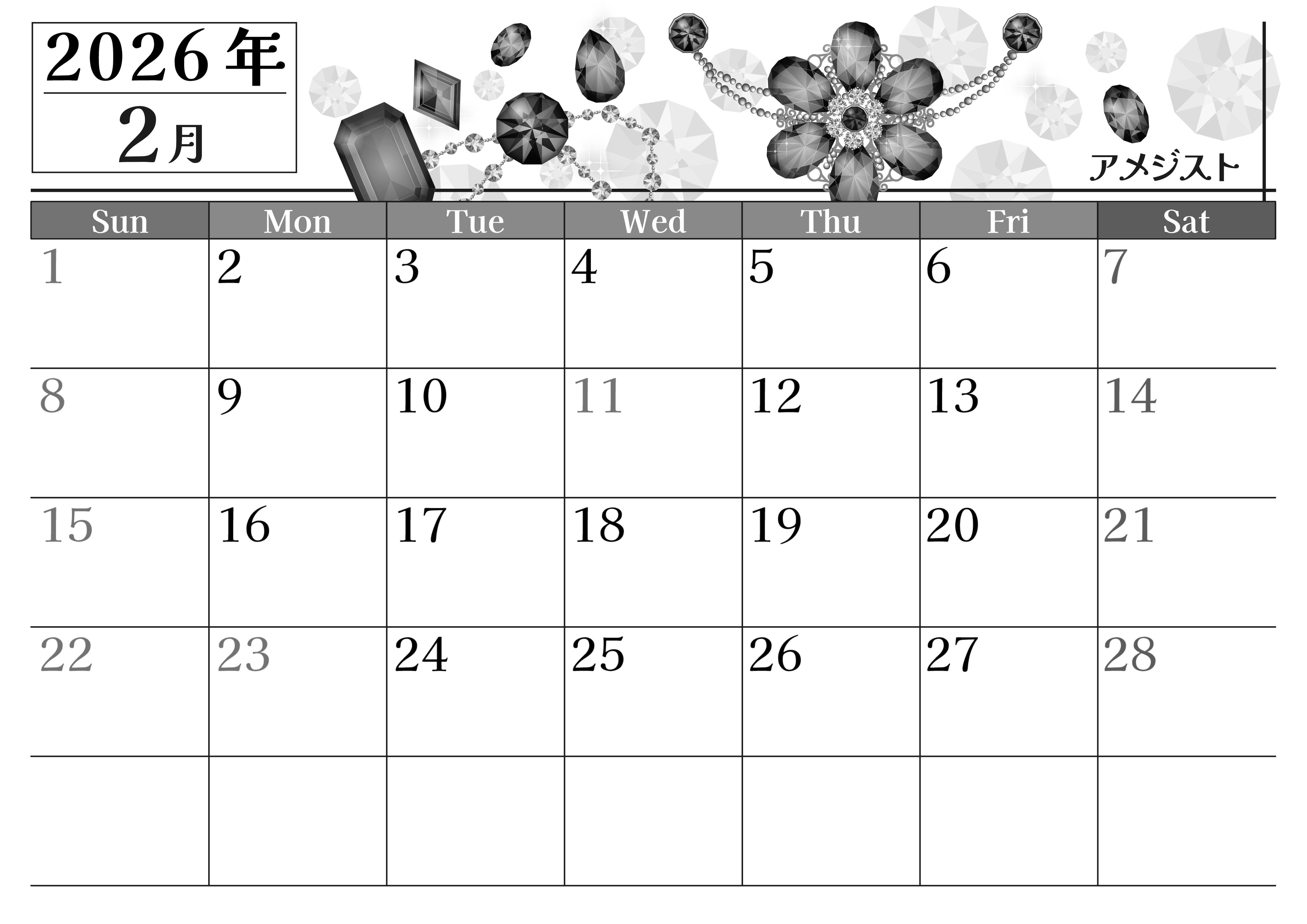 2026年2月横型モノクロの日曜始まり 誕生石イラストのおしゃれA4無料白黒カレンダー(2026-00510200)