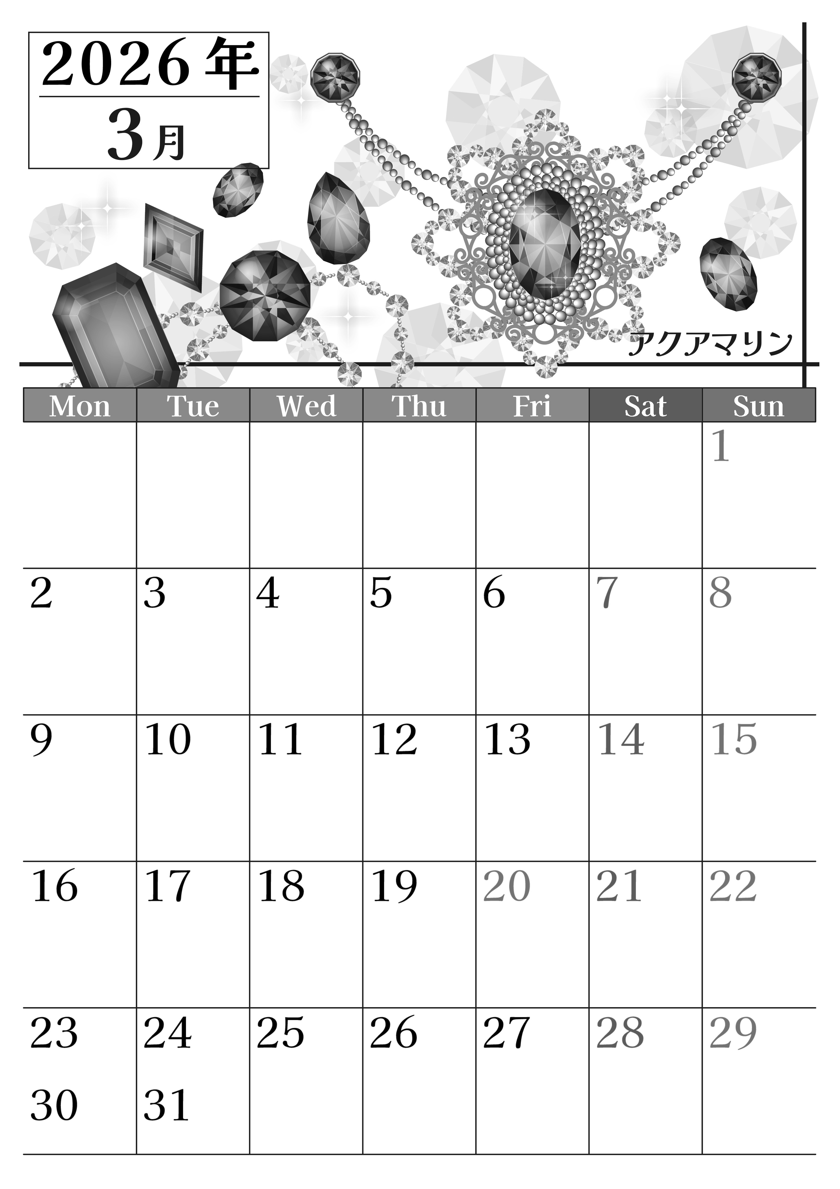 2026年3月縦型モノクロの月曜始まりの無料テンプレート白黒カレンダーです。アクアマリンは青い宝石で3月の誕生石にあたります。おしゃれで輝いている女性に特におすすめをしたいイラスト白黒カレンダーとなっています。(2026-00510311)