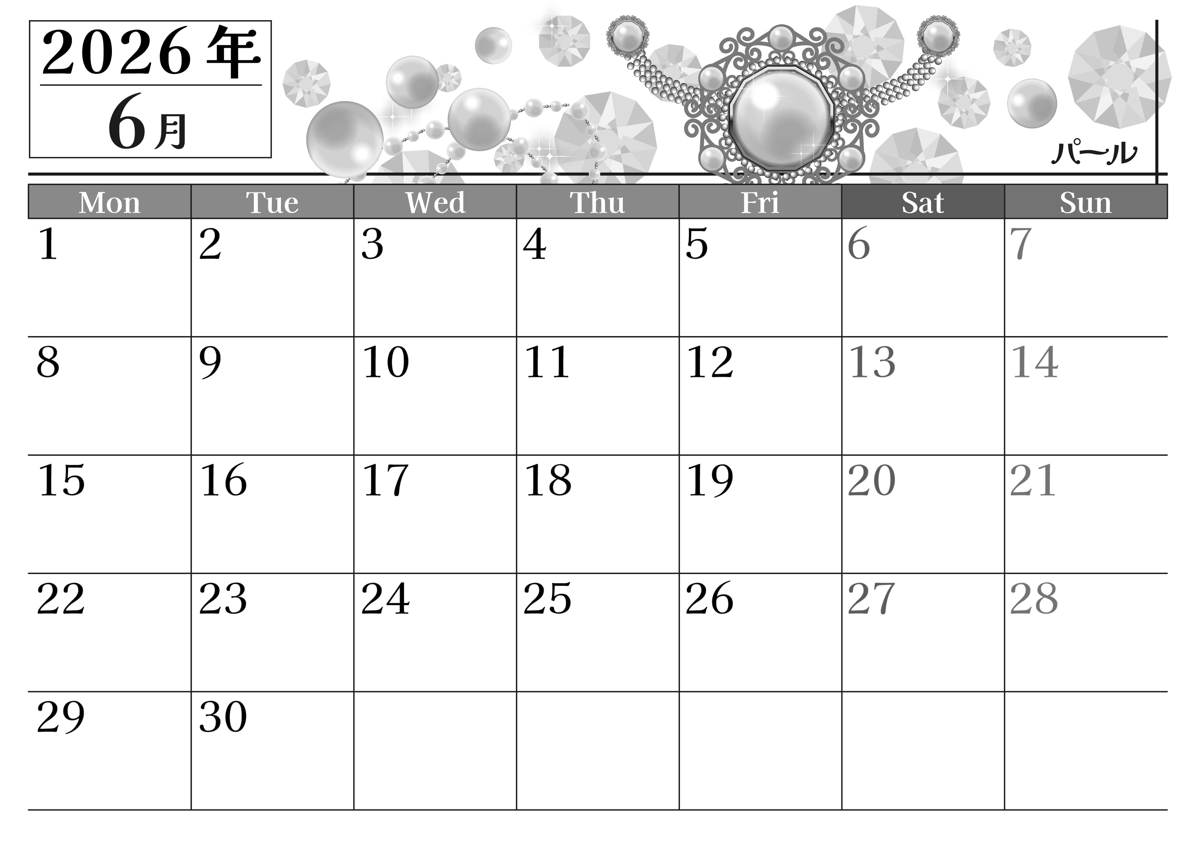 2026年6月横型モノクロの月曜始まりの無料テンプレート白黒カレンダーです。6月の誕生石であるパールを取り上げている豪華でラグジュアリーな使っていて贅沢な気持ちになるフリー素材です。(2026-00510601)