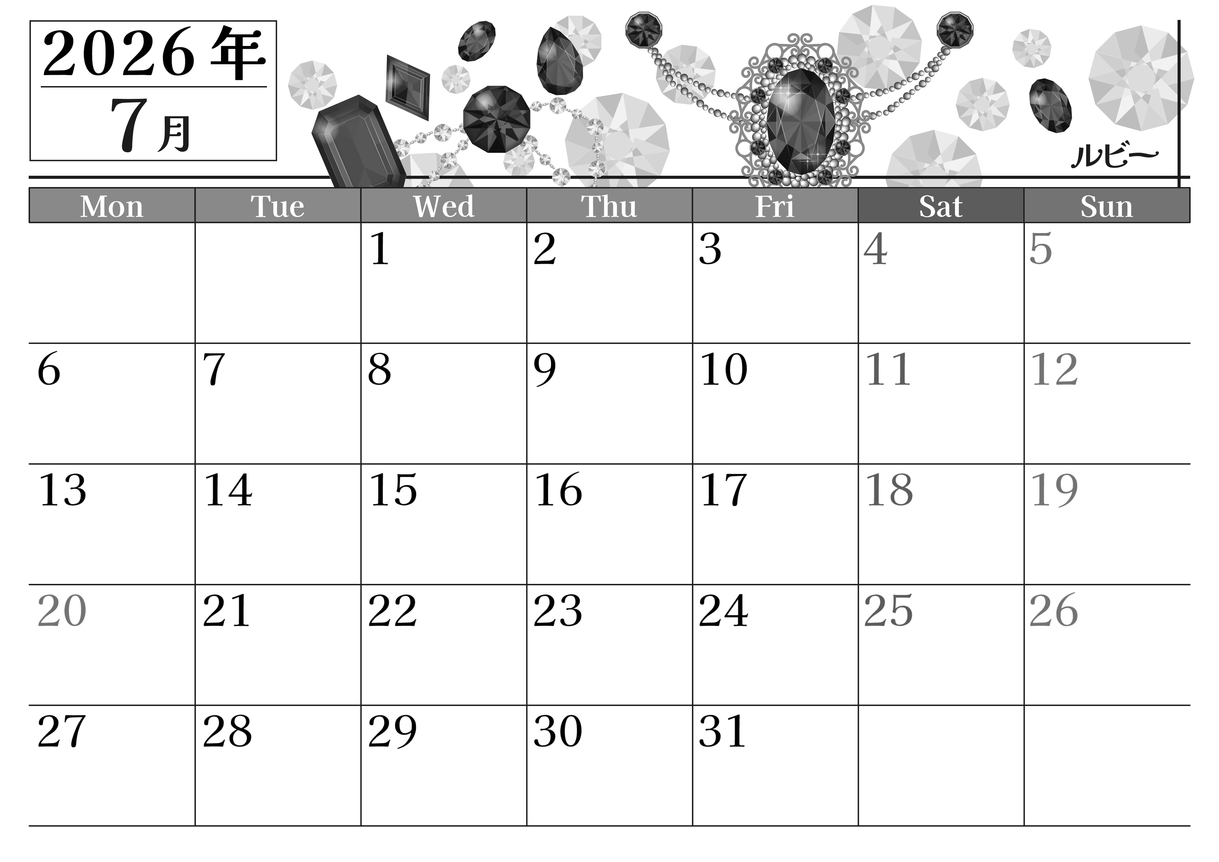 2026年・無料のカレンダーテンプレート 2026年7月横型モノクロの月曜始まり 誕生石イラストのおしゃれA4無料白黒カレンダー(2026-00510701) 素材状デザイン王 2025年4月1日 2026年7月横型モノクロの月曜始まりの無料テンプレート白黒カレンダーです。7月の誕生石であるルビーを取り上げている豪華でラグジュアリーな使っていて贅沢な気持ちになるフリー素材です。(2026-00510701) 7月 横型のカレンダー 月曜始まり 白黒 カレンダーデザイン-0051