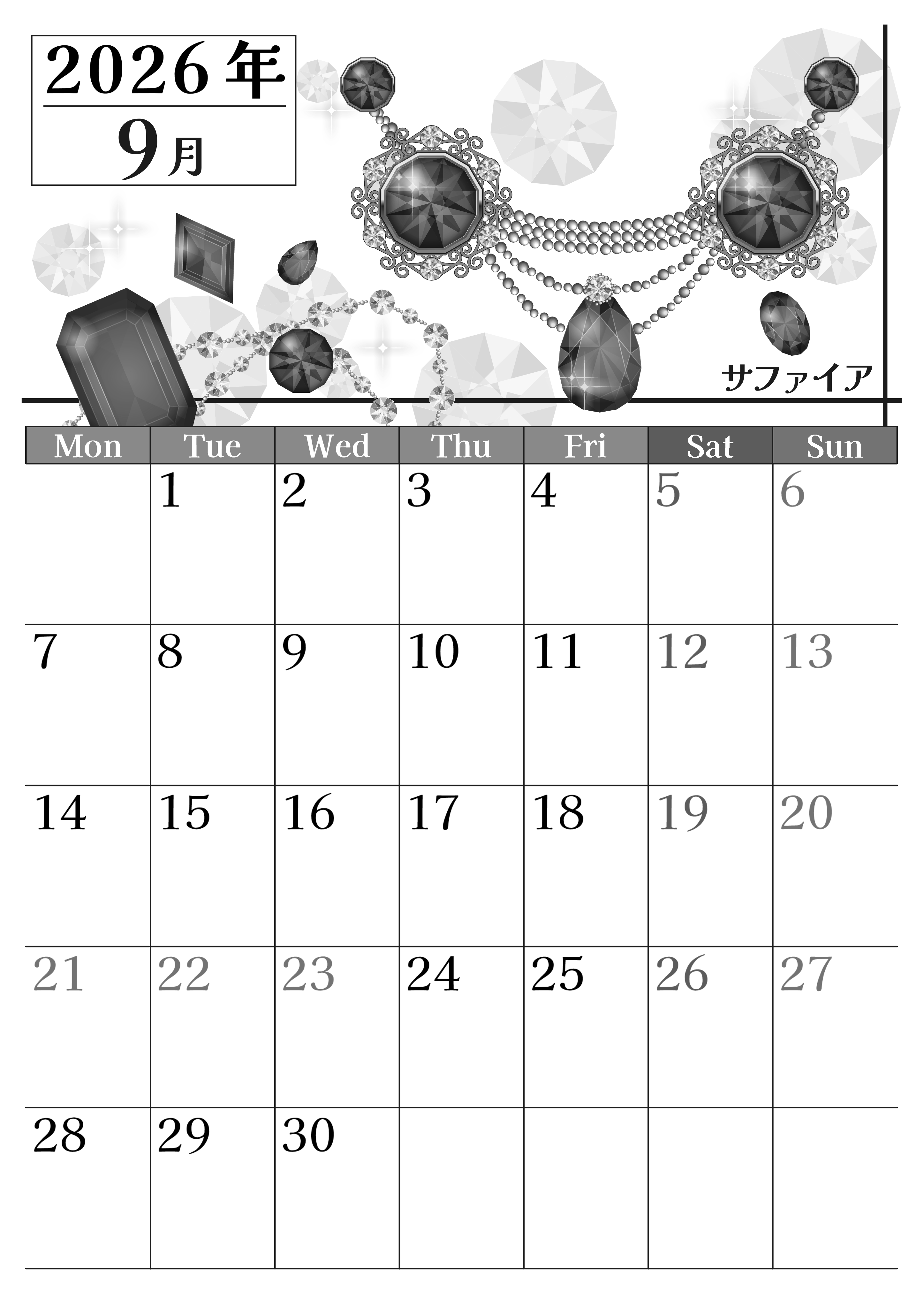2026年9月縦型モノクロの月曜始まりの無料テンプレート白黒カレンダーです。サファイアは群青色の宝石で9月の誕生石にあたります。おしゃれで輝いている女性に特におすすめをしたいイラスト白黒カレンダーとなっています。(2026-00510911)