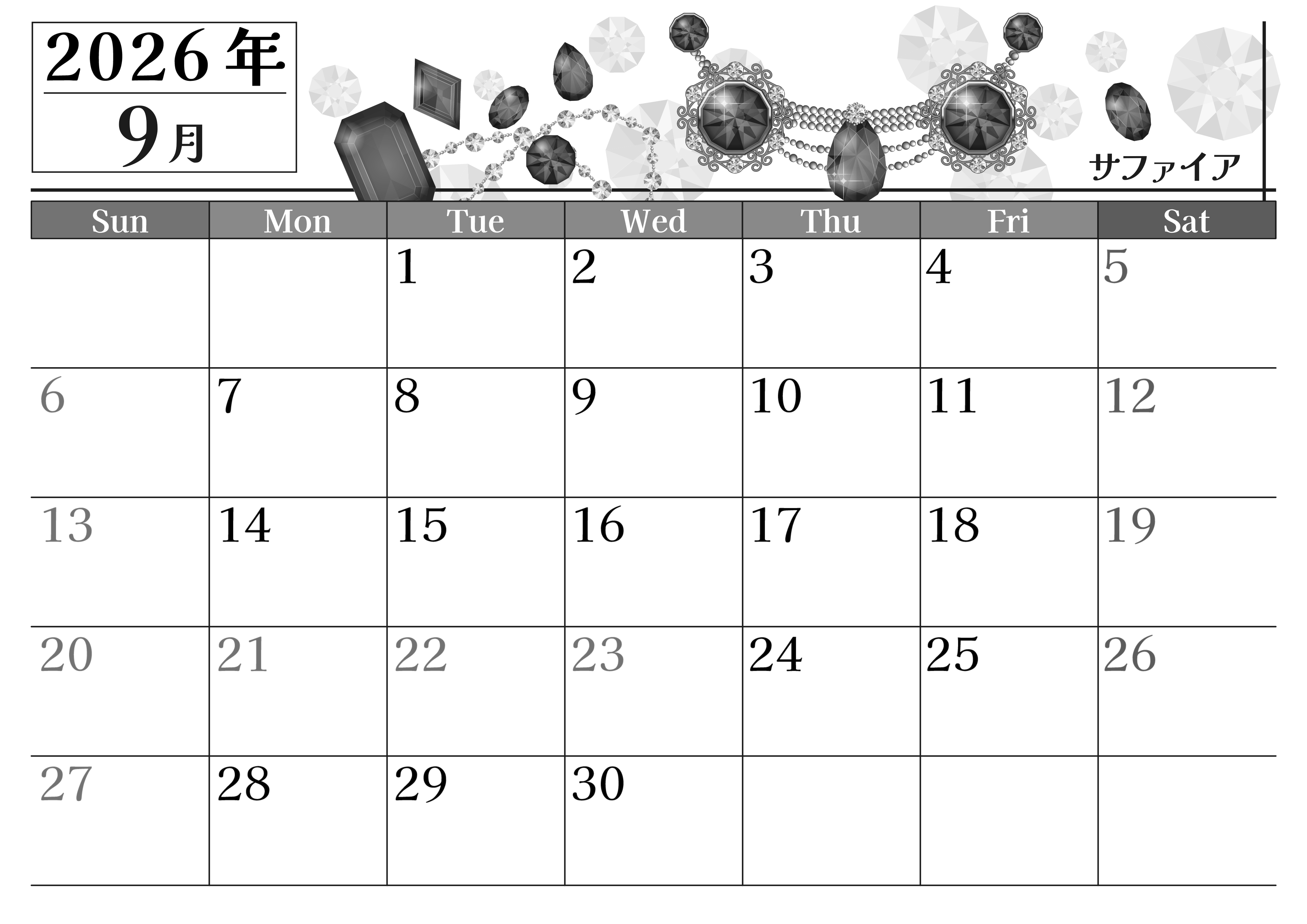 2026年9月横型モノクロの日曜始まりの無料テンプレート白黒カレンダーです。9月の誕生石であるサファイアのアクセサリーを贅沢に存在感あるように描いているおしゃれで女心をくすぐるようなイラスト白黒カレンダーです。(2026-00510900)