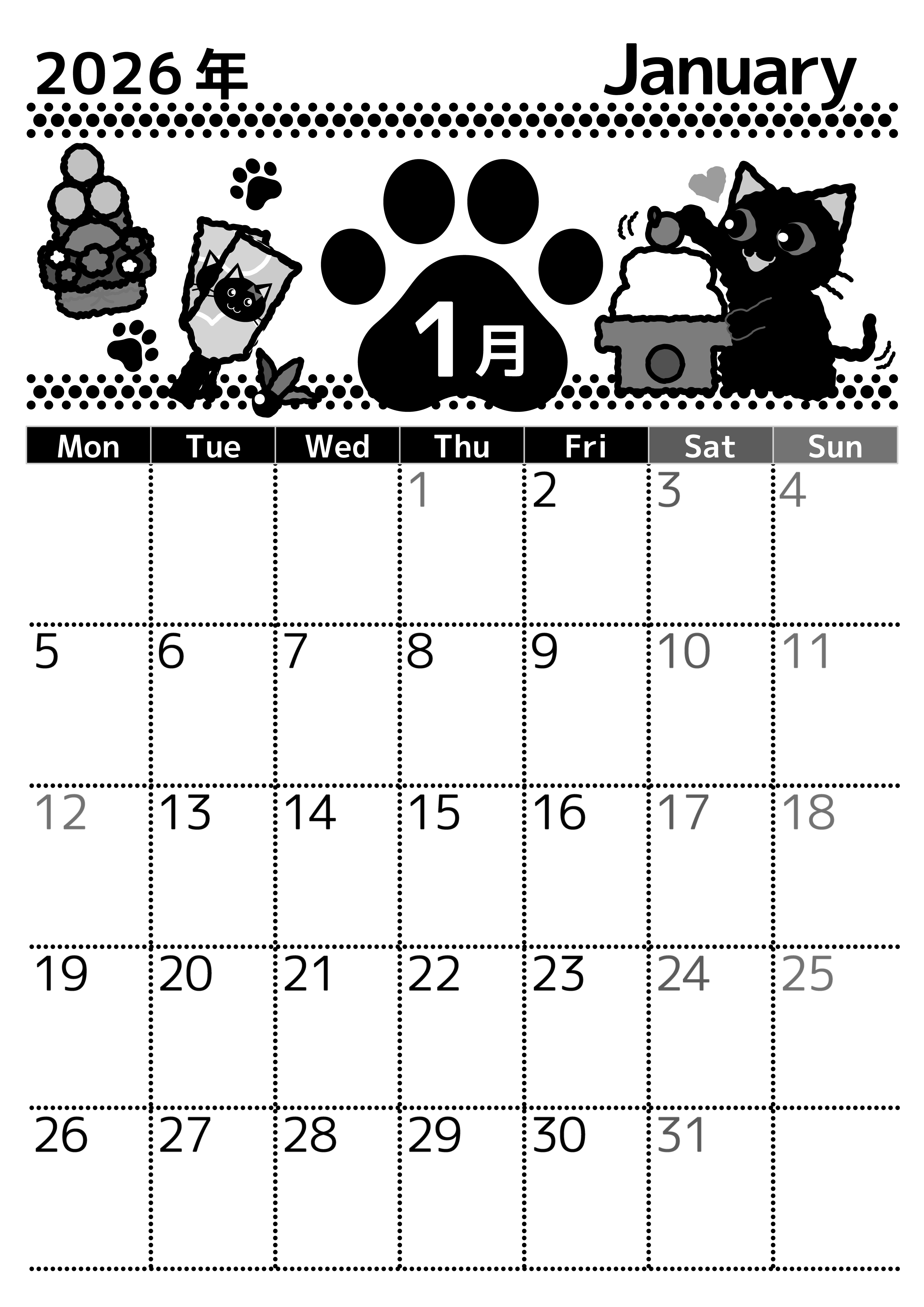 2026年1月縦型モノクロの月曜始まり イラストのかわいいA4無料白黒カレンダー(2026-00520111)