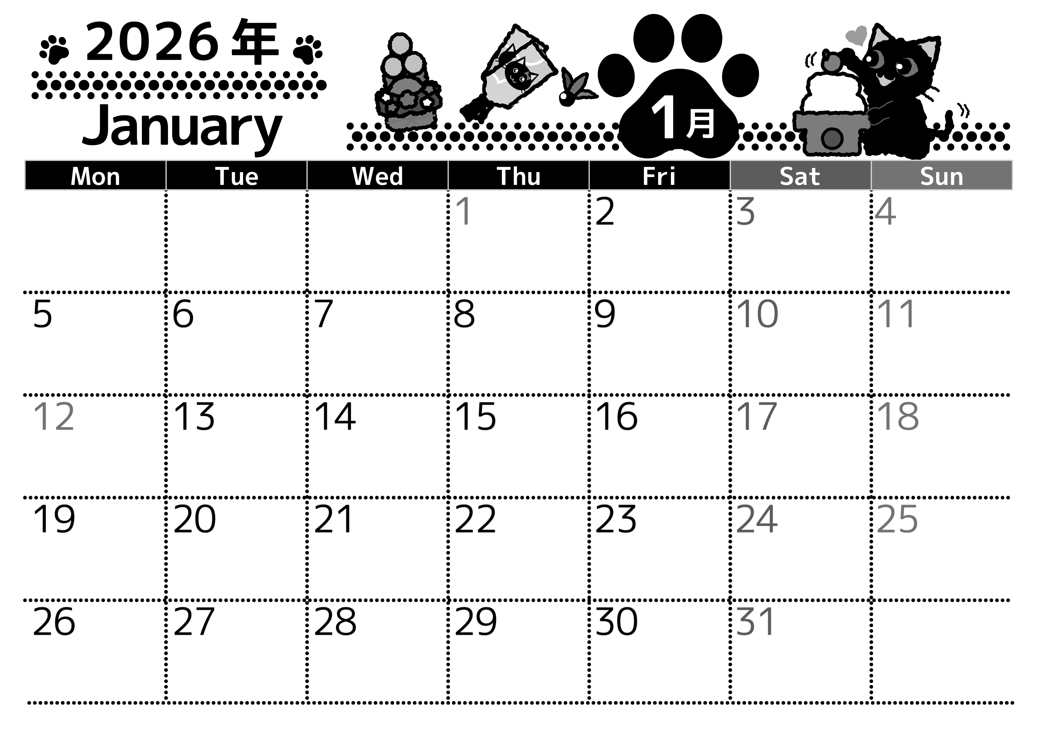 2026年・無料のカレンダーテンプレート 2026年1月横型モノクロの月曜始まり イラストのかわいいA4無料白黒カレンダー(2026-00520101) 素材状デザイン王 2025年4月1日 2026年1月横型モノクロの月曜始まりの無料テンプレート白黒カレンダーです。かわいい子猫のイラストが魅力的でありながらスケジュールを書き込みやすいスタンダードでシンプルなデザインです。(2026-00520101) 1月 横型のカレンダー 月曜始まり 白黒 カレンダーデザイン-0052