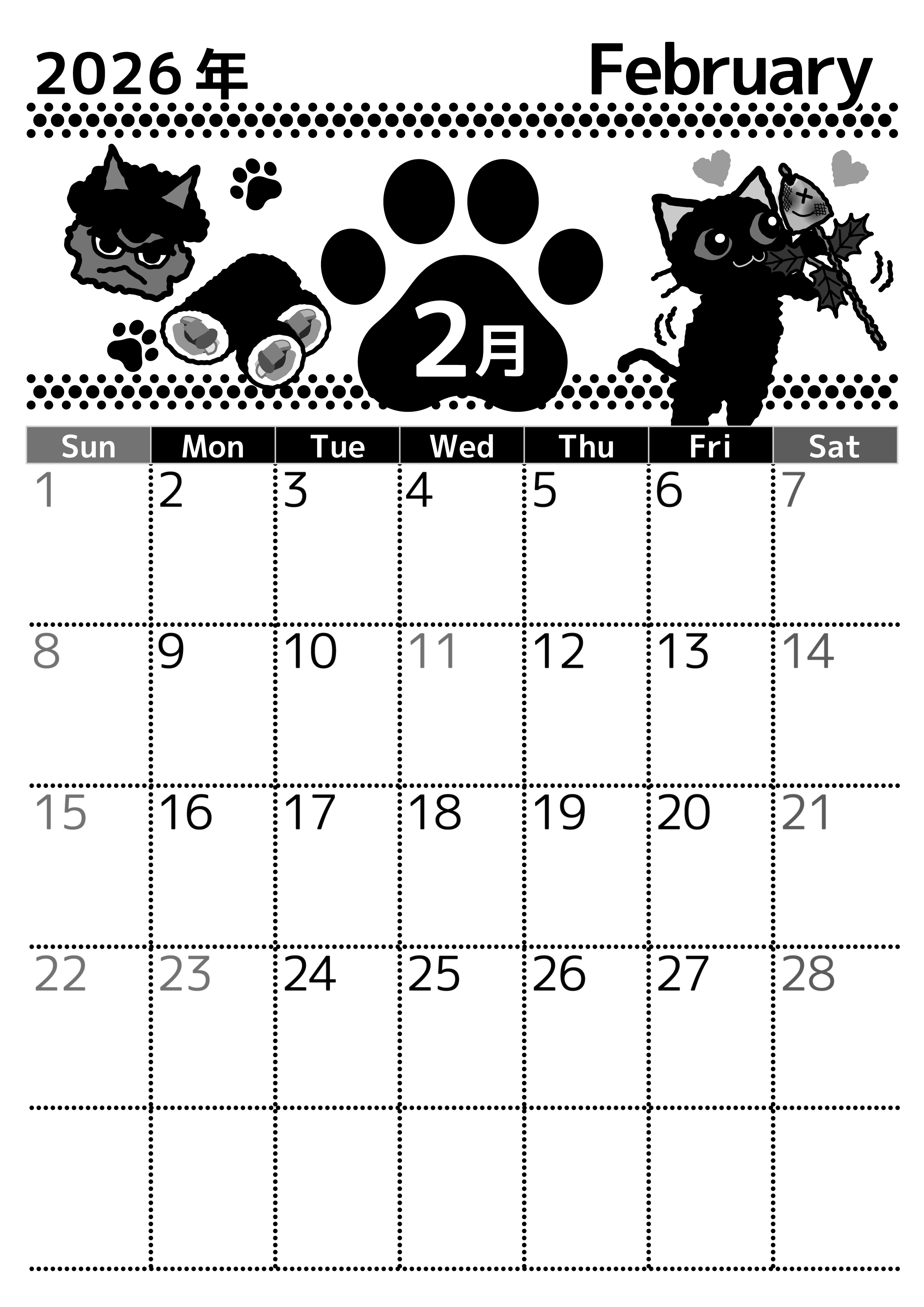 2026年・無料のカレンダーテンプレート 2026年2月縦型モノクロの日曜始まり イラストのかわいいA4無料白黒カレンダー(2026-00520210) 素材状デザイン王 2025年4月1日 2026年2月縦型モノクロの日曜始まりの無料テンプレート白黒カレンダーです。猫の遊び心をあちこちにちりばめた見やすくて実用性の高い白黒カレンダーとなっております。(2026-00520210) 2月 縦型のカレンダー 日曜始まり 白黒 カレンダーデザイン-0052