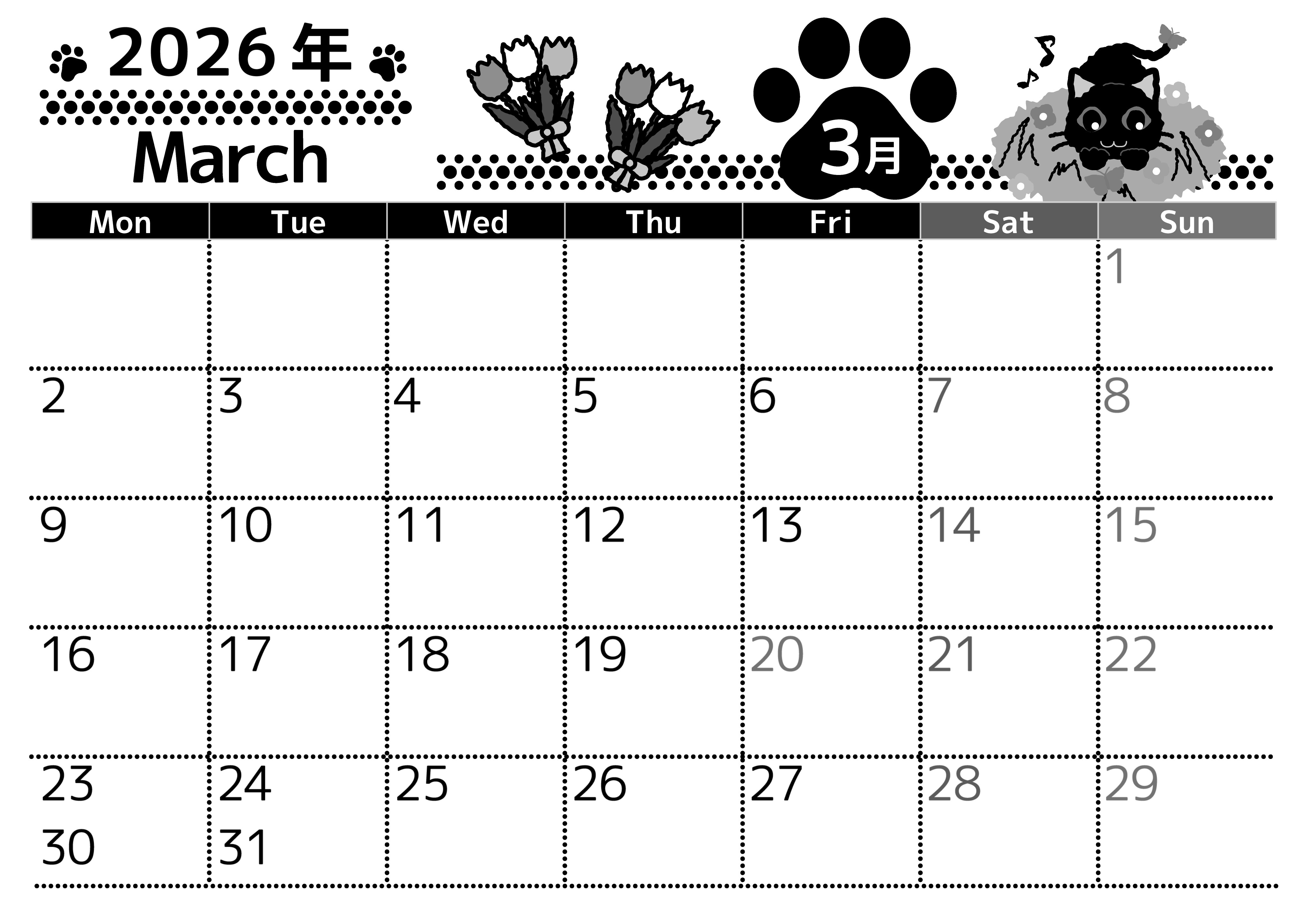 2026年・無料のカレンダーテンプレート 2026年3月横型モノクロの月曜始まり 猫イラストのかわいいA4無料白黒カレンダー(2026-00520301) 素材状デザイン王 2025年4月1日 2026年3月横型モノクロの月曜始まりの無料テンプレート白黒カレンダーです。白黒カレンダーなのでインクの消費を押さえつつもかわいい白黒カレンダーをサクサク印刷できて便利です。猫もワンポイントです。(2026-00520301) 3月 横型のカレンダー 月曜始まり 白黒 カレンダーデザイン-0052