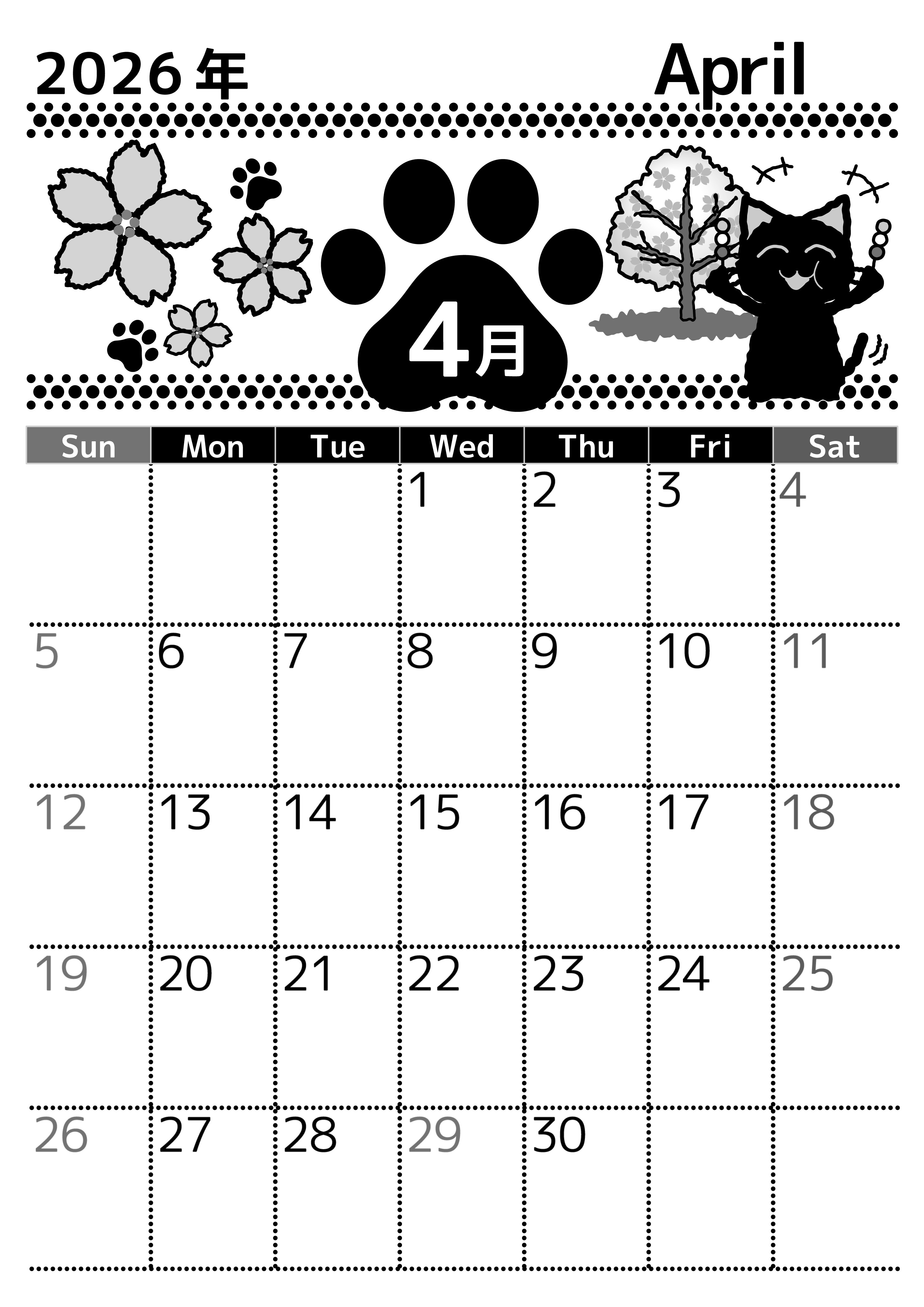 2026年4月縦型モノクロの日曜始まりの無料テンプレート白黒カレンダーです。猫の足跡に「4月」の文字が書き込まれているのが遊び心のあるデザインでかわいい春の雰囲気も盛り込んでいるイラストとなっています。(2026-00520410)