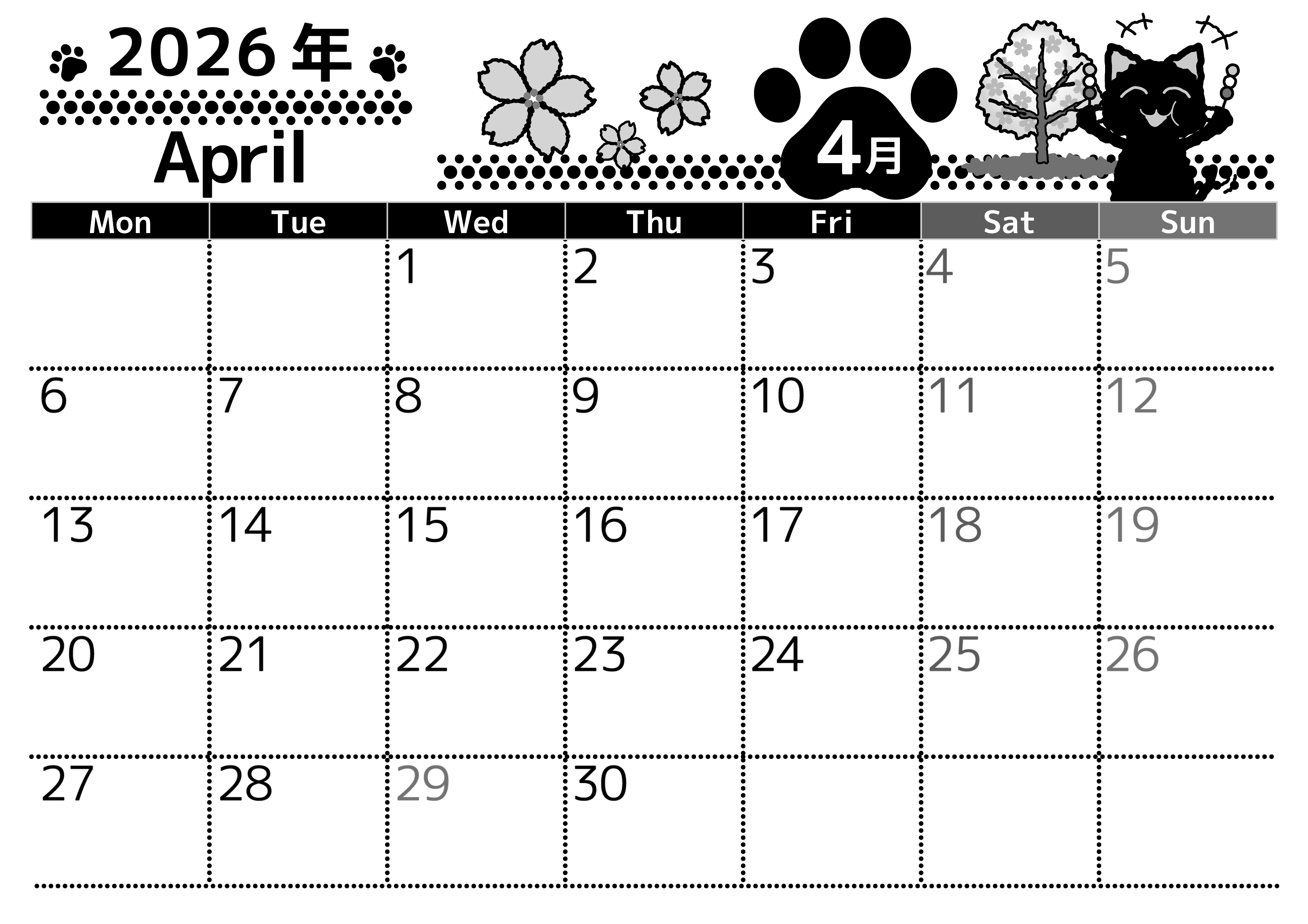 2026年4月横型モノクロの月曜始まりの無料テンプレート白黒カレンダーです。日にちの数字が大きすぎないので予定を書き込みやすいレイアウトとなっています。イラスト部分の猫ちゃんもかわいいので猫好きにオススメです。(2026-00520401)