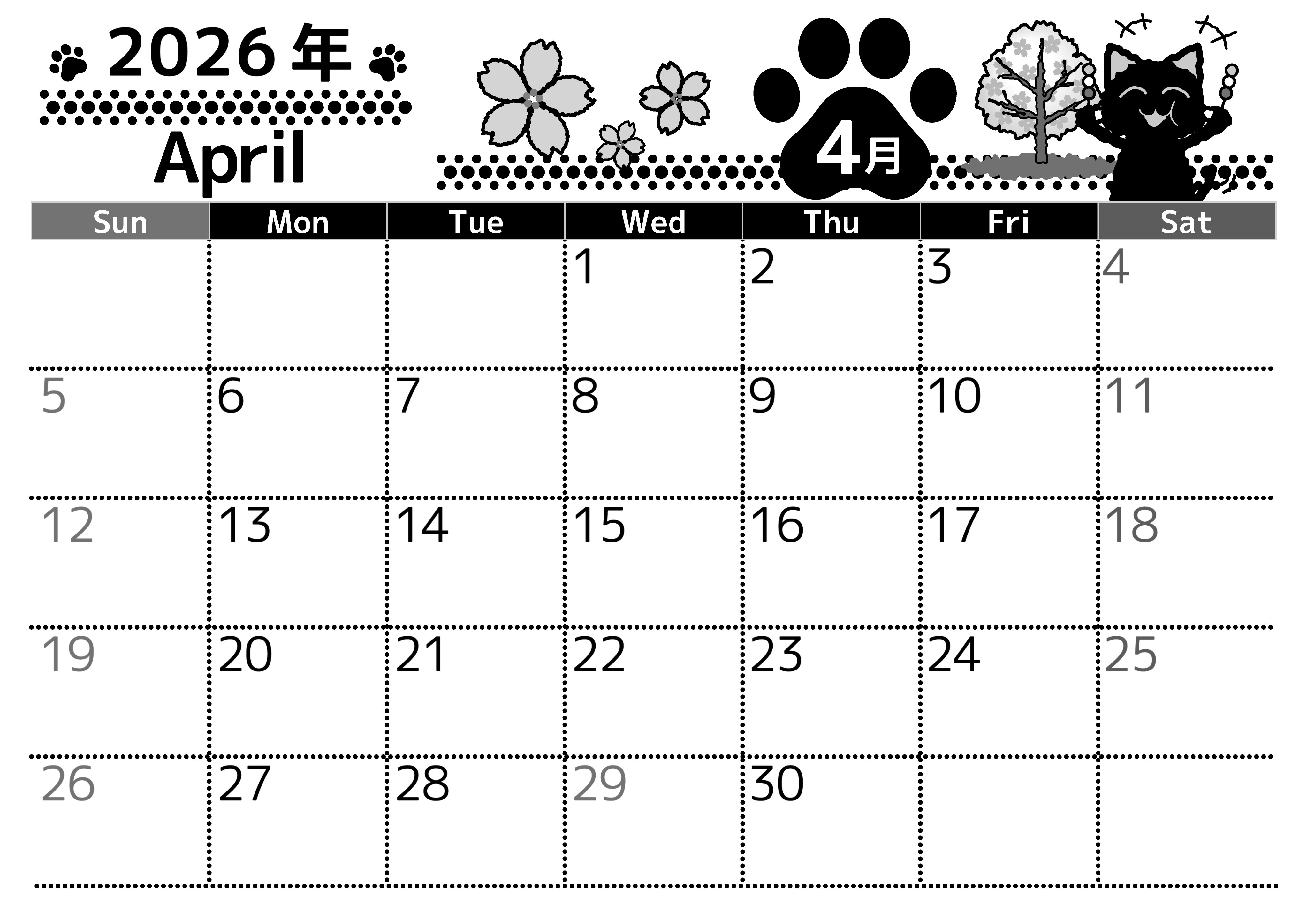 2026年4月横型モノクロの日曜始まりの無料テンプレート白黒カレンダーです。くっきりとした線で描かれた桜の木々と元気いっぱいの猫がとてもかわいいイラスト付きフリー白黒カレンダーです。黒をメインカラーにしています。(2026-00520400)