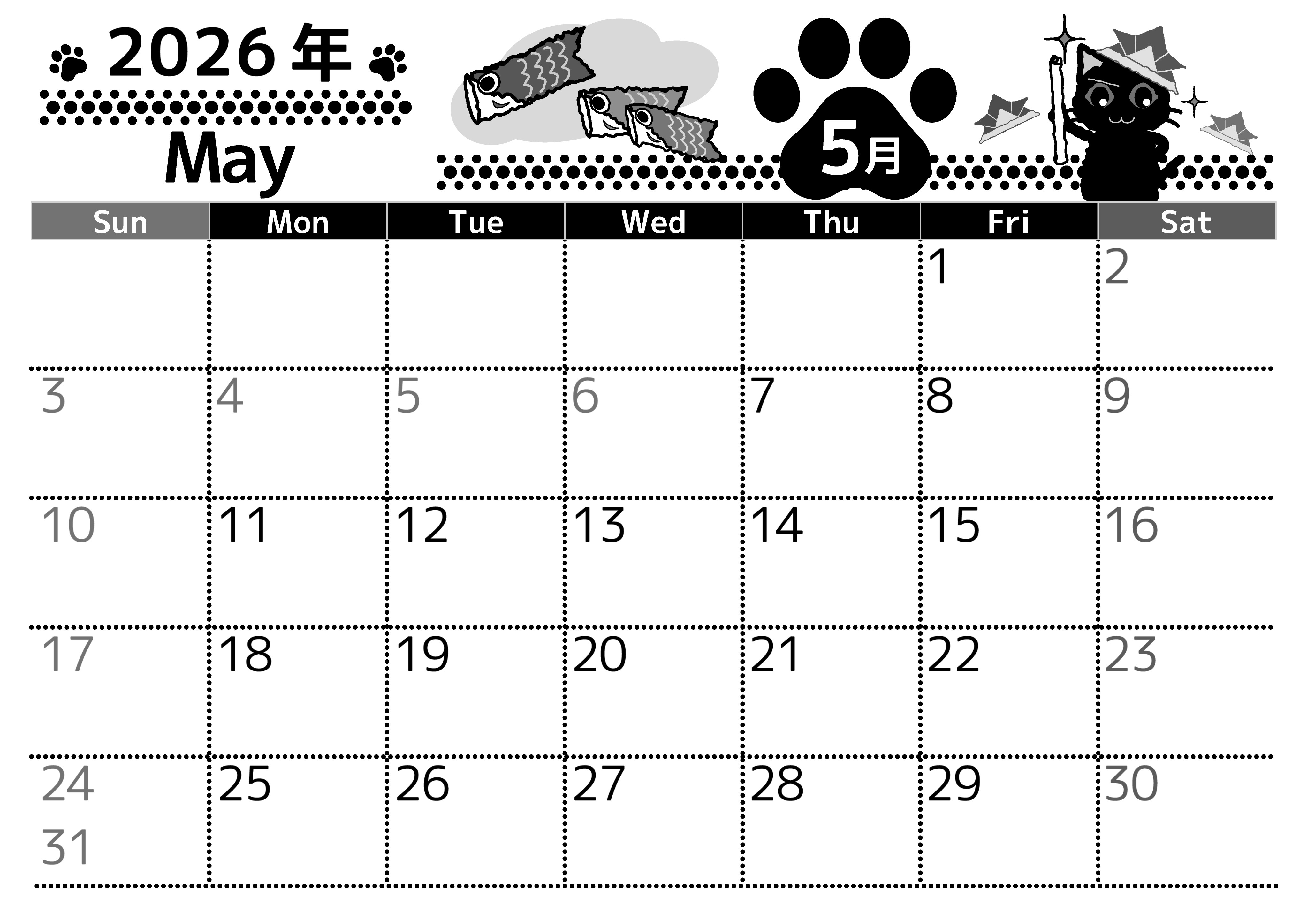 2026年5月横型モノクロの日曜始まり 猫イラストのかわいいA4無料白黒カレンダー(2026-00520500)