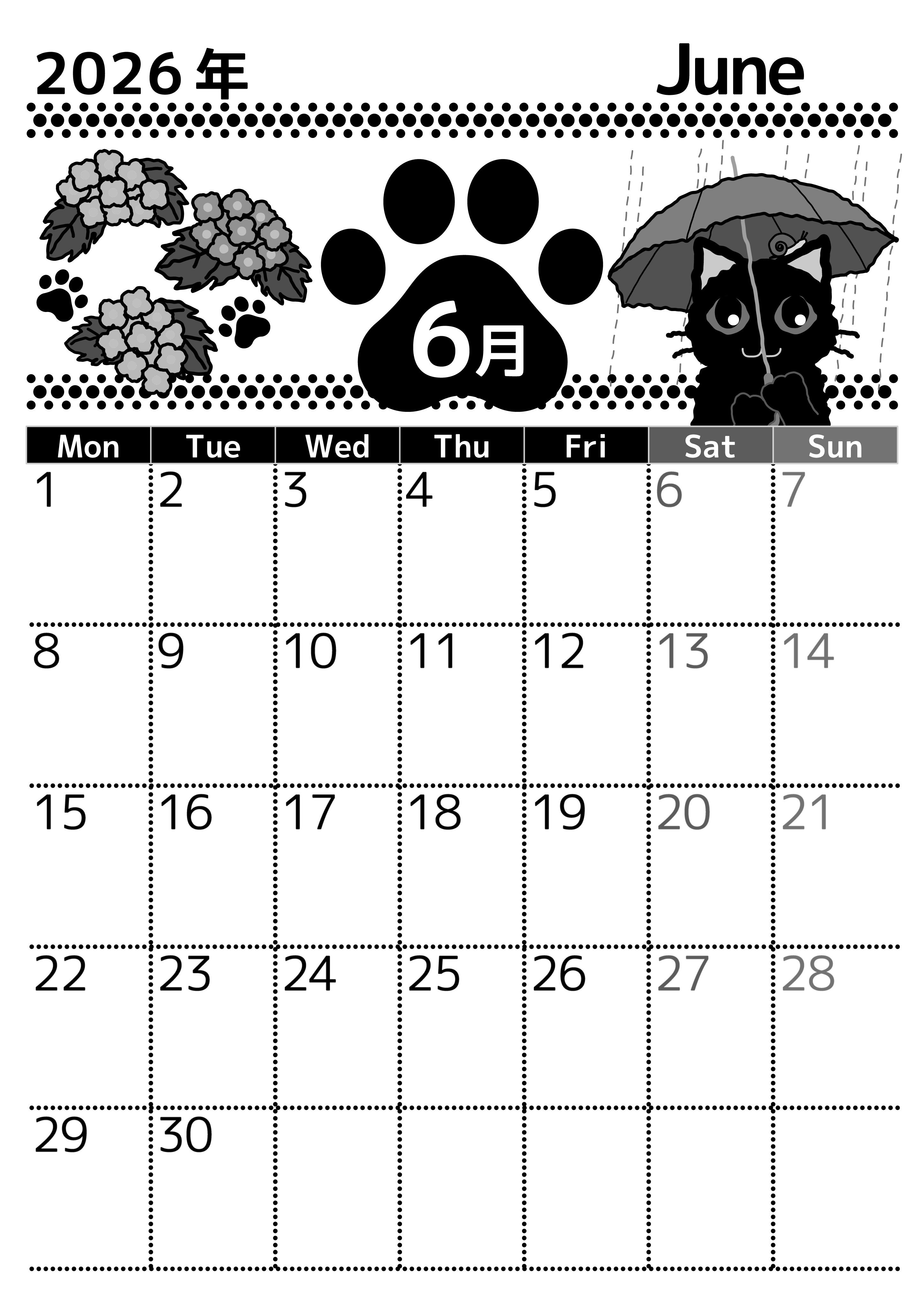 2026年6月縦型モノクロの月曜始まりの無料テンプレート白黒カレンダーです。猫の肉球に「6月」の文字が白抜きされているかわいいだけでなく見やすい実用性の高い白黒カレンダー素材となっています。予定をたくさん書き込みたいという人におすすめのレイアウトです。(2026-00520611)