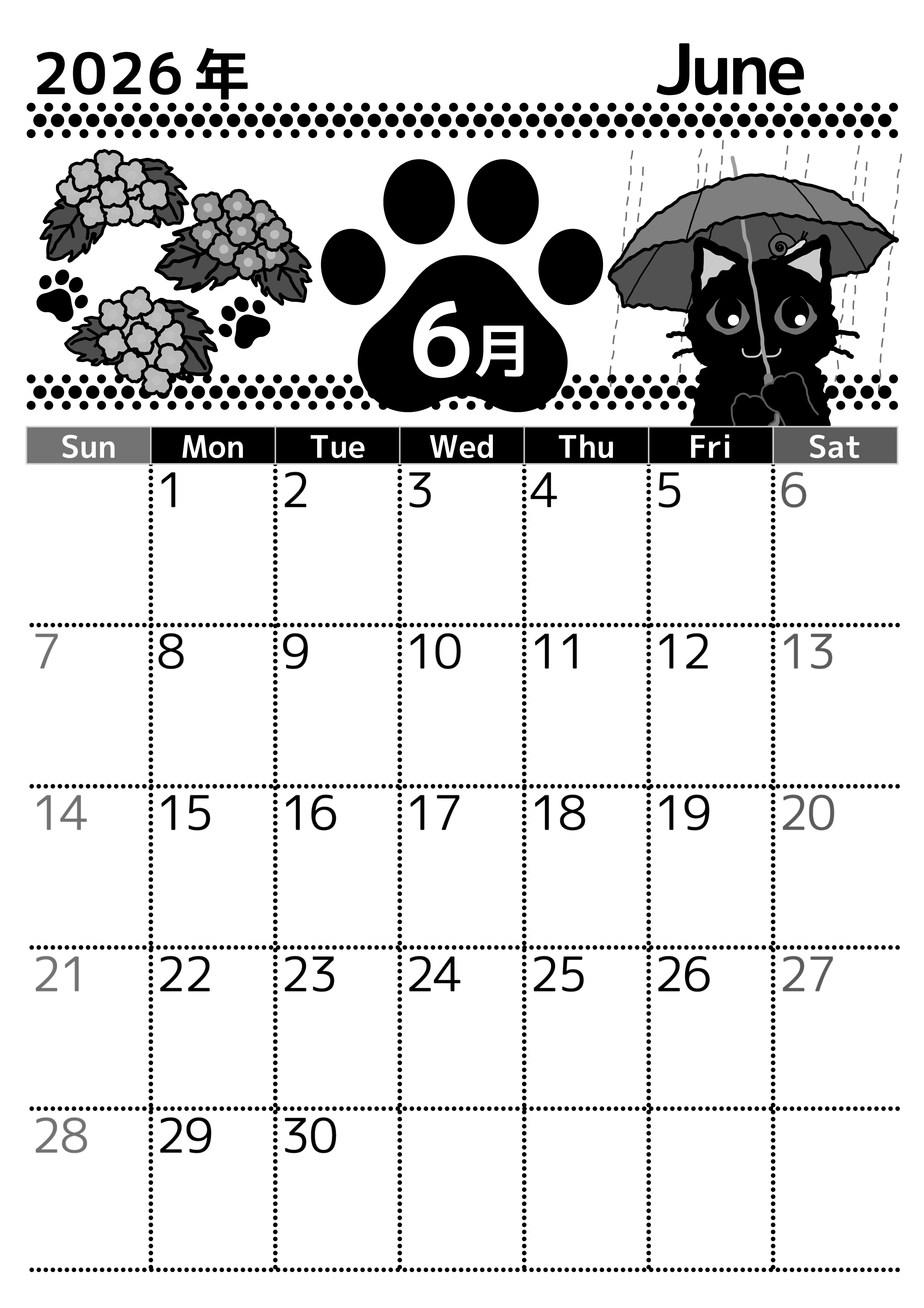 2026年6月縦型モノクロの日曜始まりの無料テンプレート白黒カレンダーです。梅雨の憂鬱な気持ちを紛らわしてくれるようなかわいい猫と紫陽花のイラストがおすすめポイントの見やすい便利な白黒カレンダー素材です。(2026-00520610)