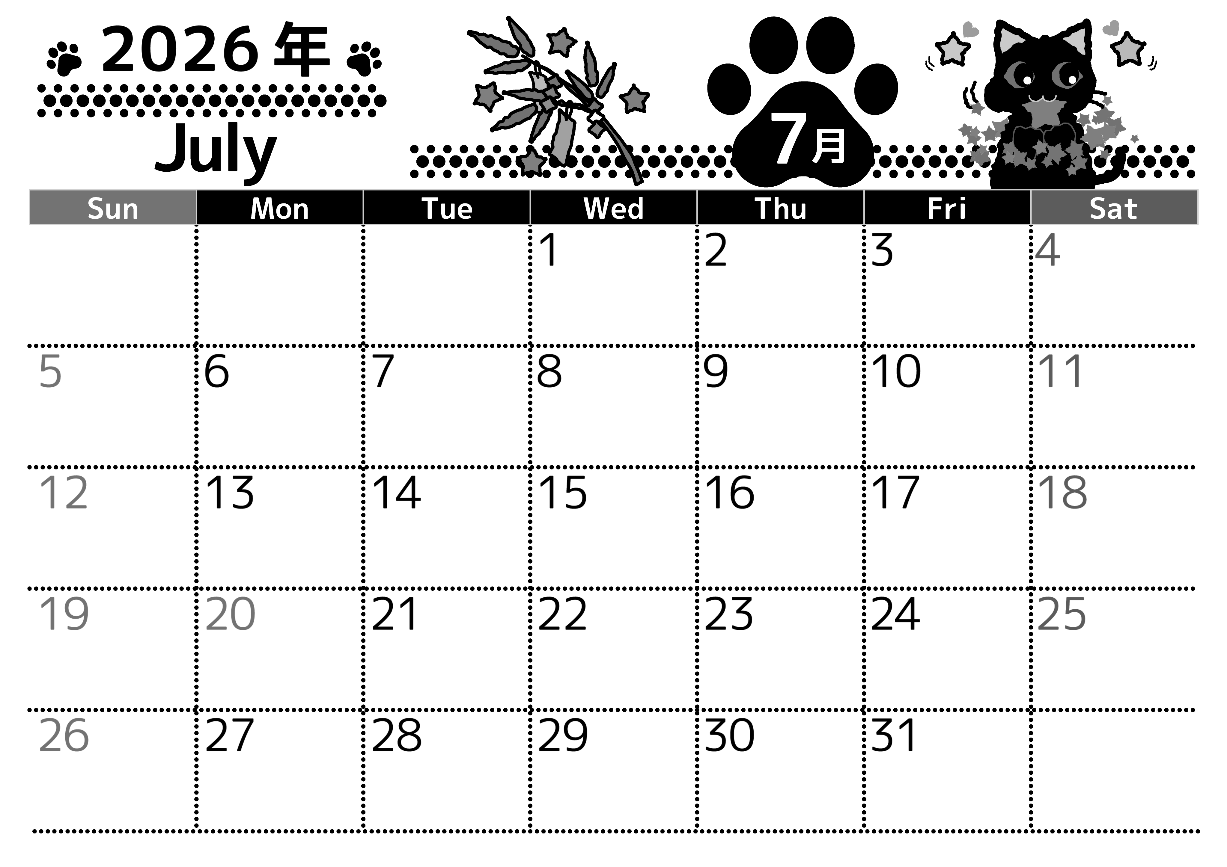 2026年7月横型モノクロの日曜始まりの無料テンプレート白黒カレンダーです。七夕の装飾がっぷりなされた竹と星に囲まれている猫のイラストがかわいいだけでなく白黒カレンダー部分は余白がたっぷりなので予定を書き込みやすいです。(2026-00520700)
