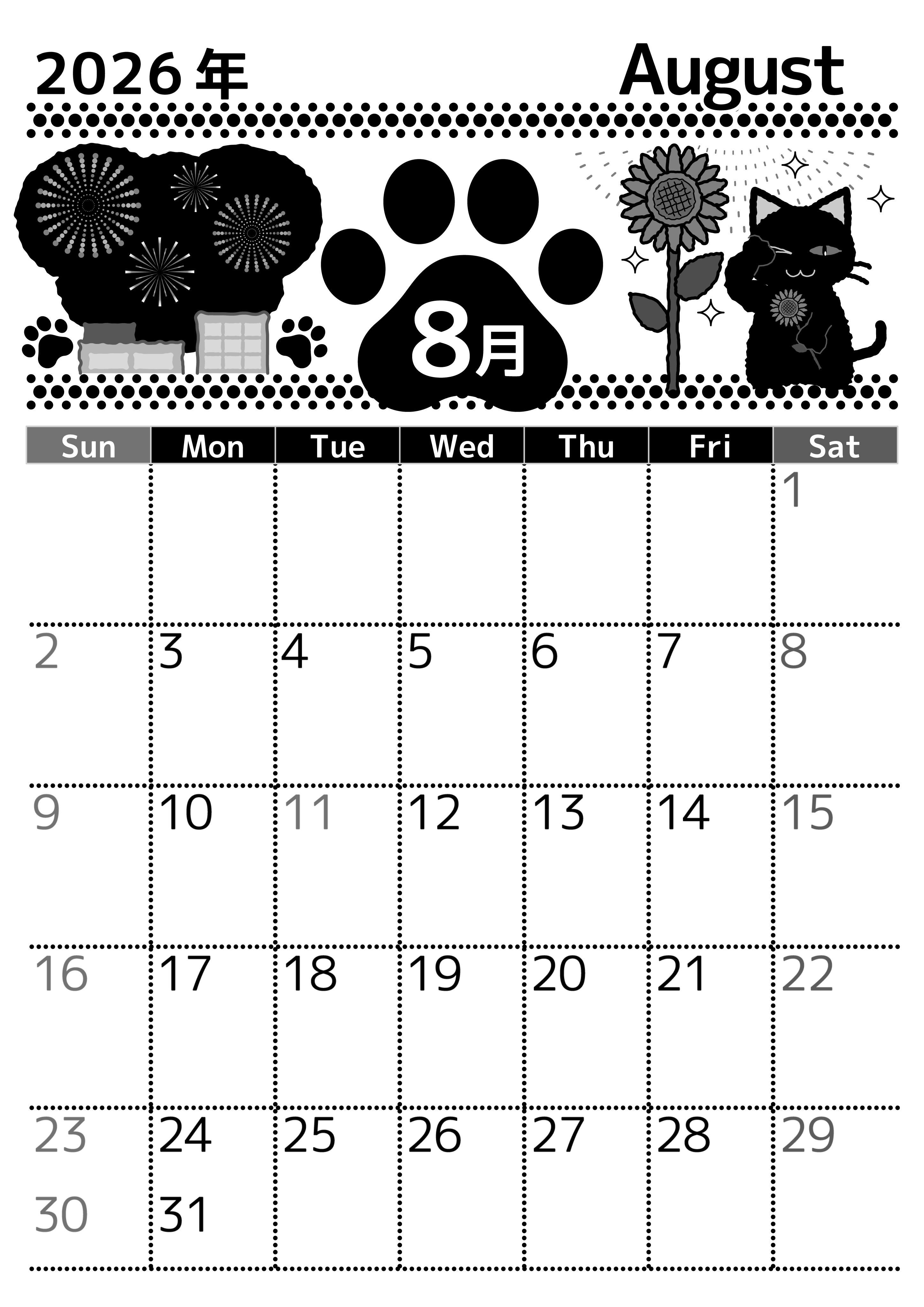 2026年8月縦型モノクロの日曜始まりの無料テンプレート白黒カレンダーです。夏祭りを思わせるような打ち上げ花火のイラストとひまわりのイラストが目を引くフリー素材です。猫もかわいいワンポイントとなっています。(2026-00520810)