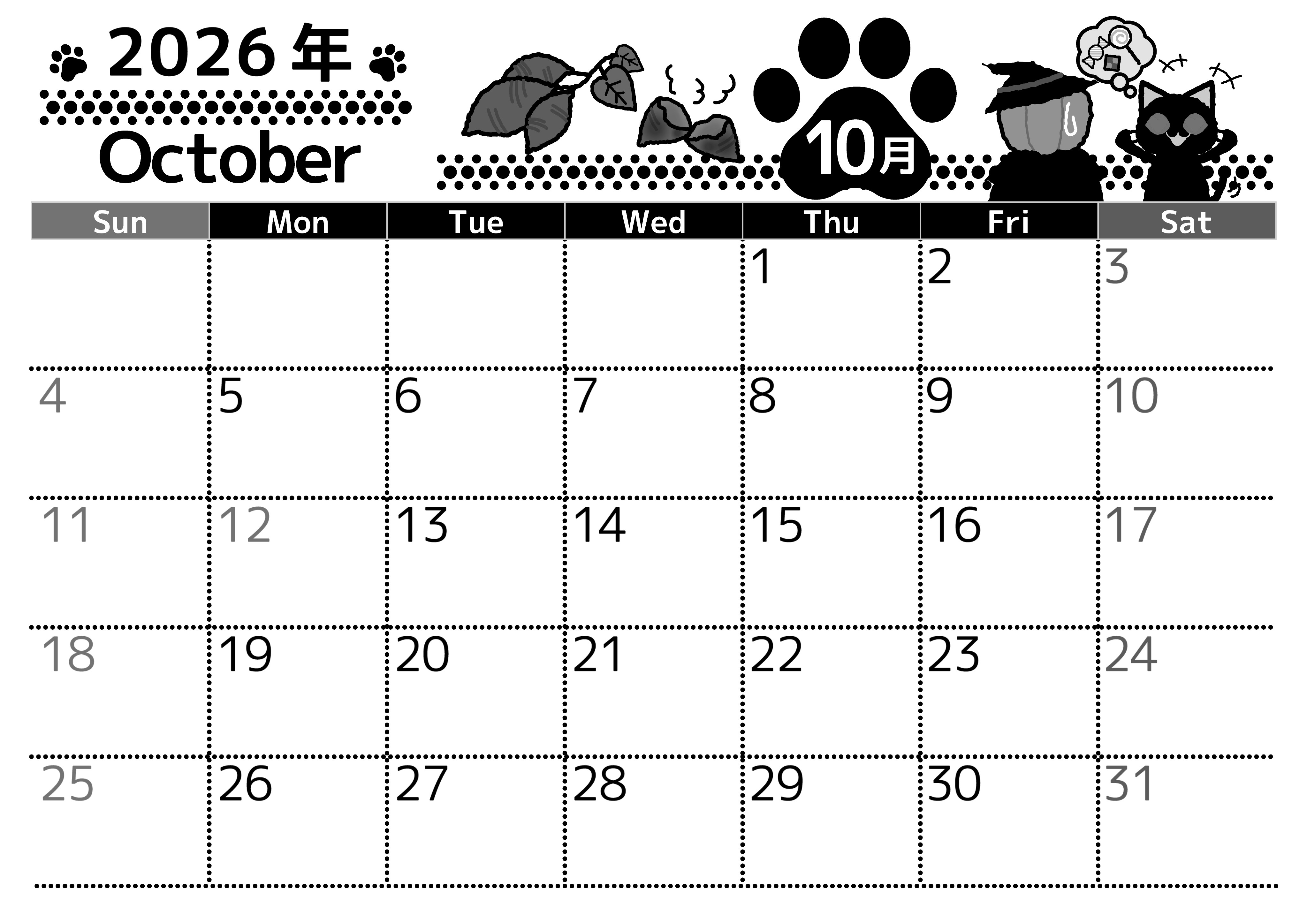 2026年10月横型モノクロの日曜始まり 猫イラストのかわいいA4無料白黒カレンダー(2026-00521000)