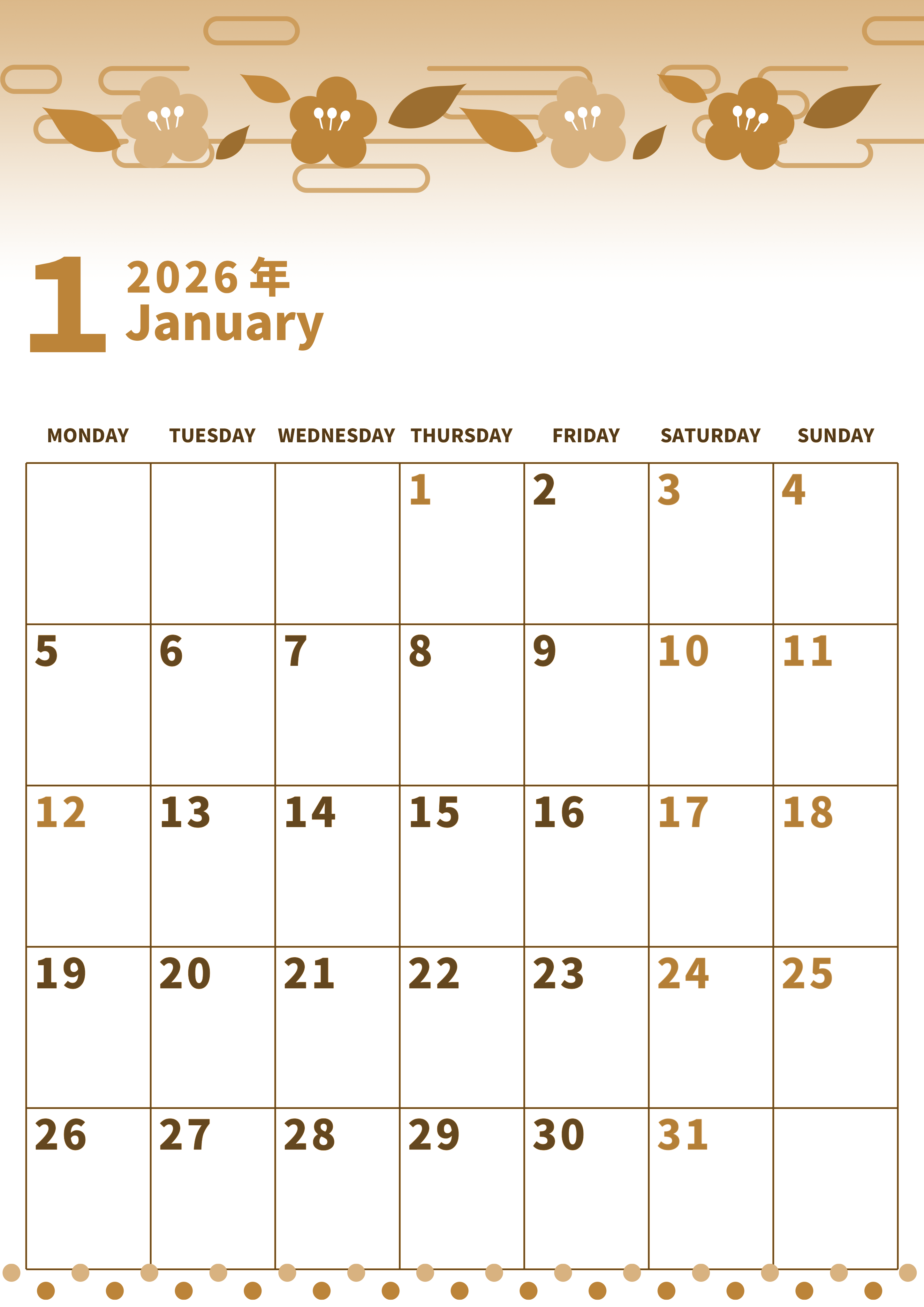 2026年1月カレンダー縦型で月曜始まりのフリー素材です。お仕事をされている方や子育てをされている方にとってとても見やすいかわいいセピア調カレンダーなので2026年のスタートダッシュである1月にぴったりなファミリー向けなレイアウトとなっています。(2026-00530111)