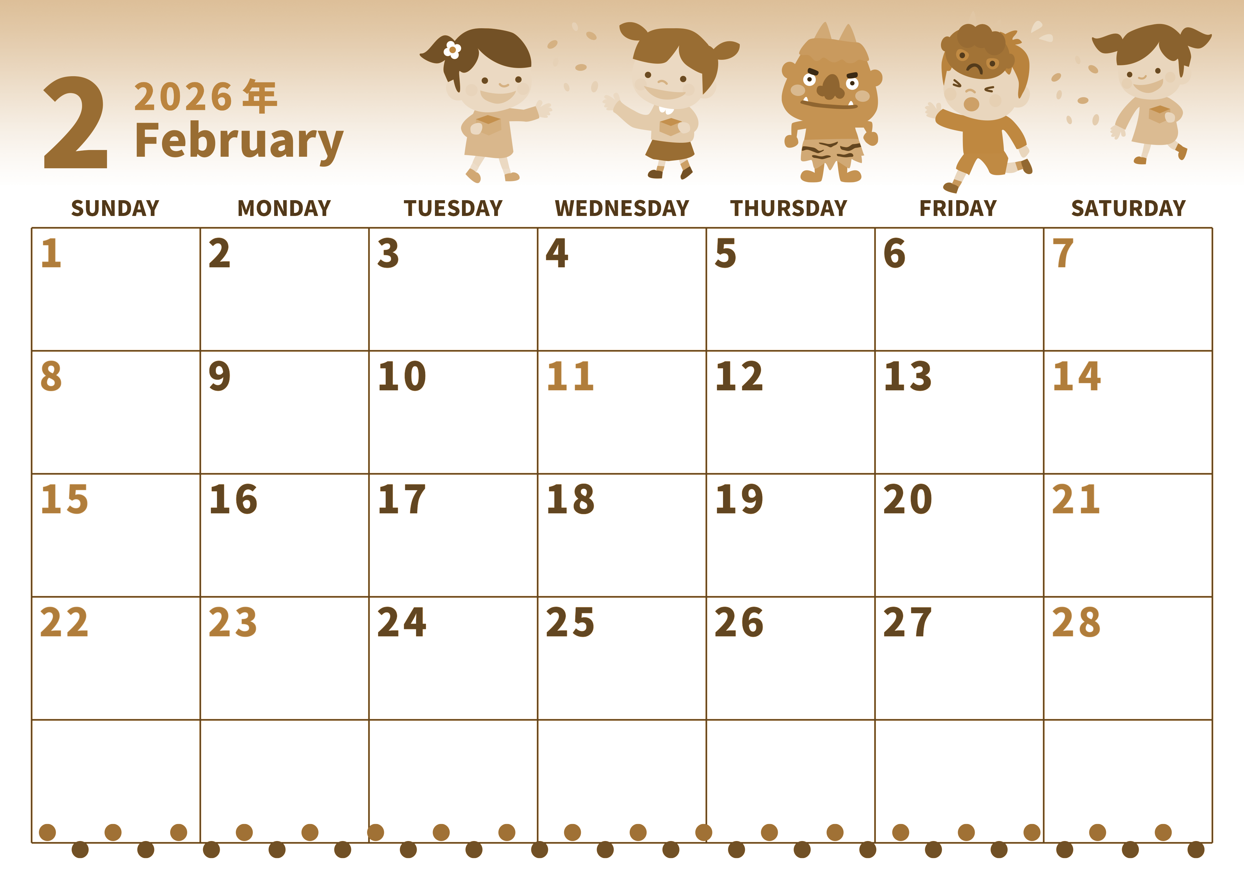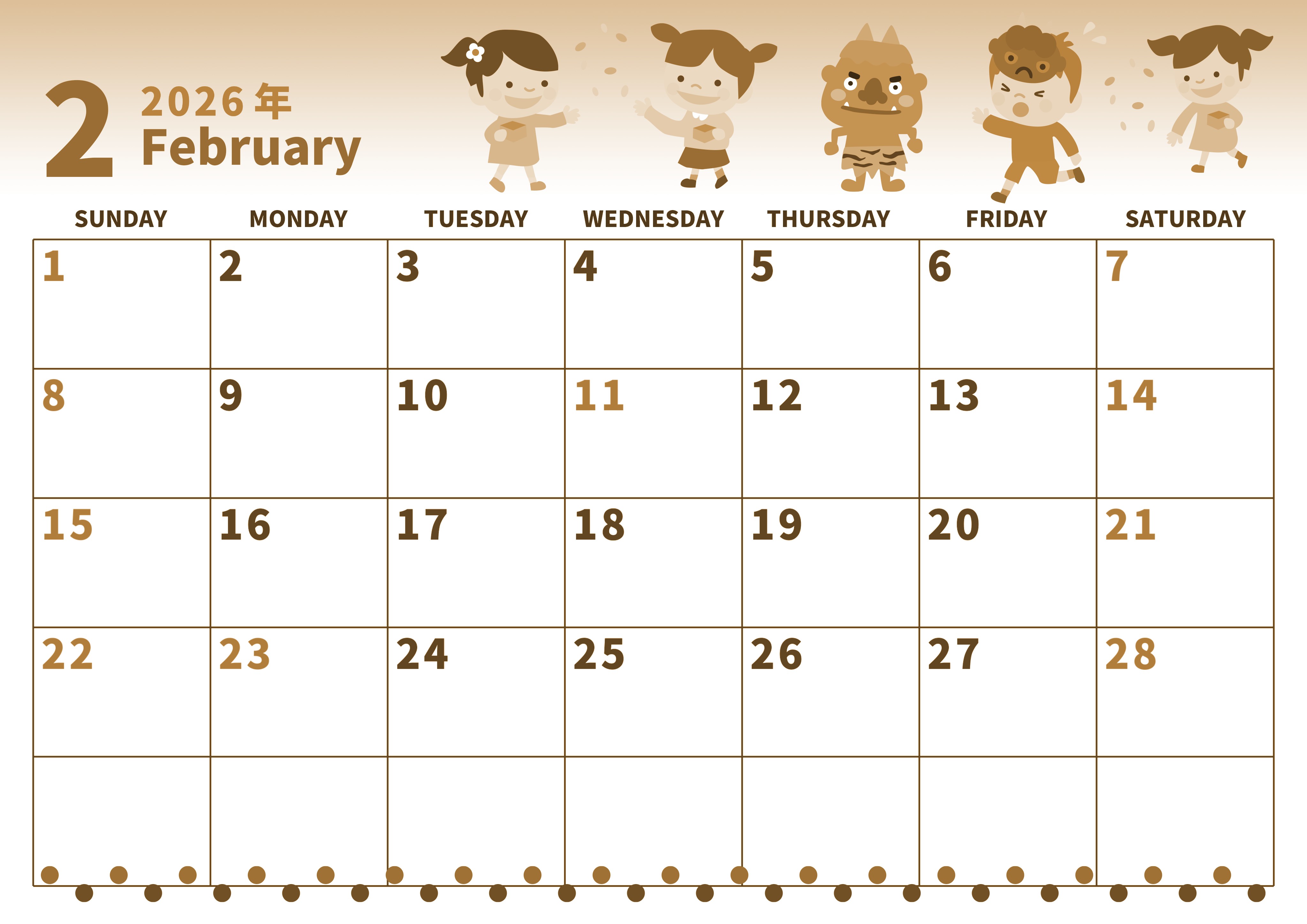 2026年2月横型レトロな日曜始まりの無料テンプレートセピア調カレンダーです。男の子と女の子が仲良さそうに鬼は外福は内と和気あいあいと戯れているイラストが和むA4サイズのスケジュールが書き込みできるフリー素材です。(2026-00530200)