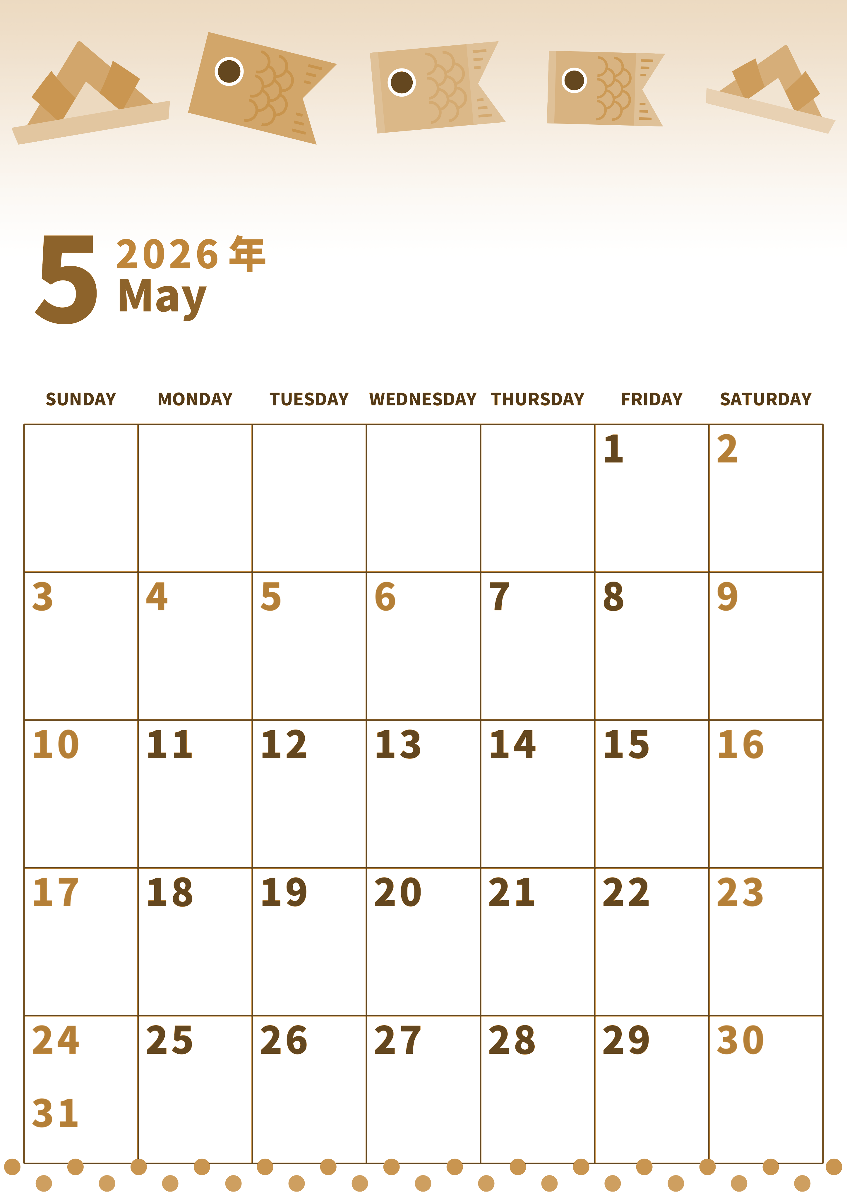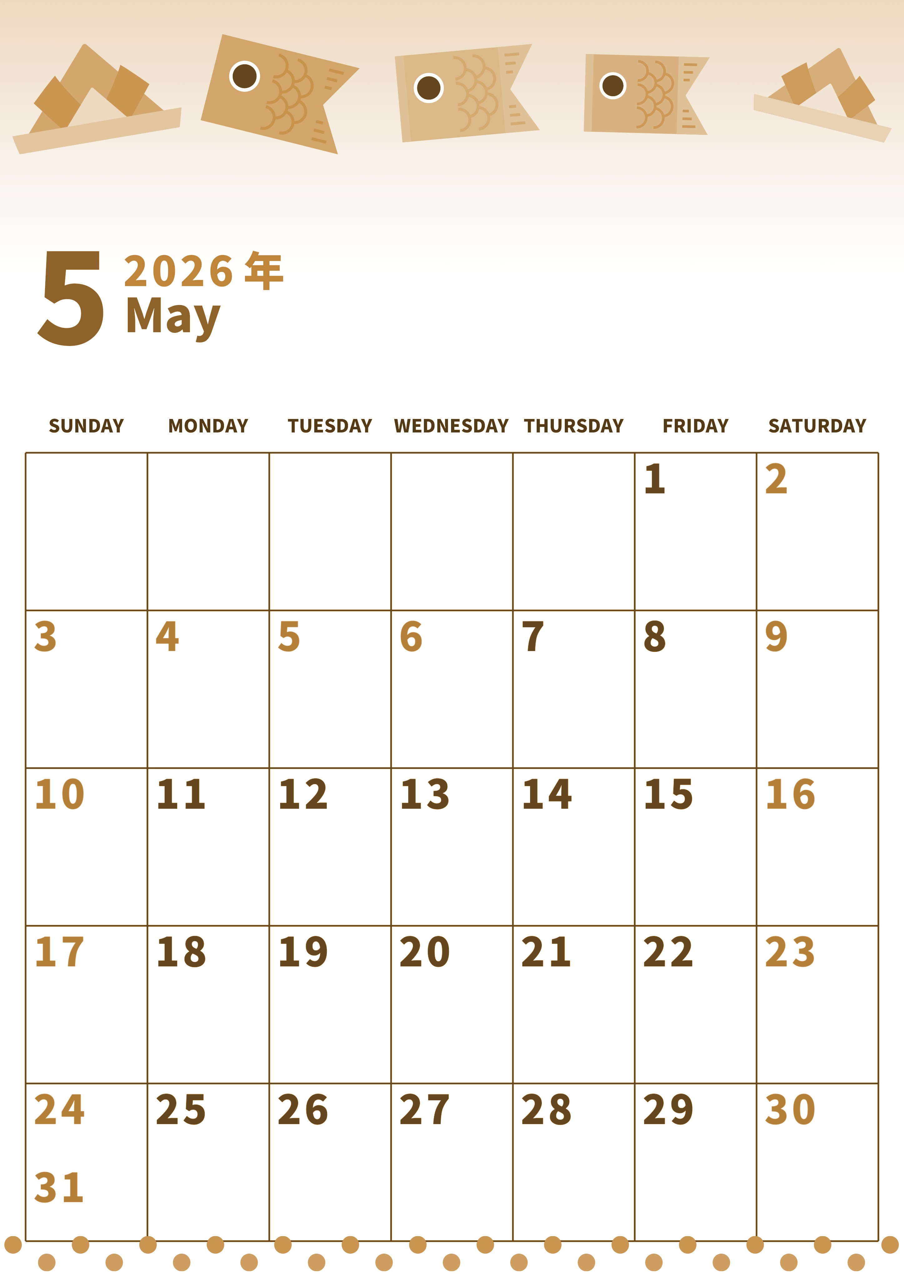 2026年5月縦型レトロな日曜始まりの無料テンプレートセピア調カレンダーです。縦型でイラストも充実している使っていて楽しくなるようなかわいいイラストセピア調カレンダーです。鯉のぼりがチャームポイントです。(2026-00530510)