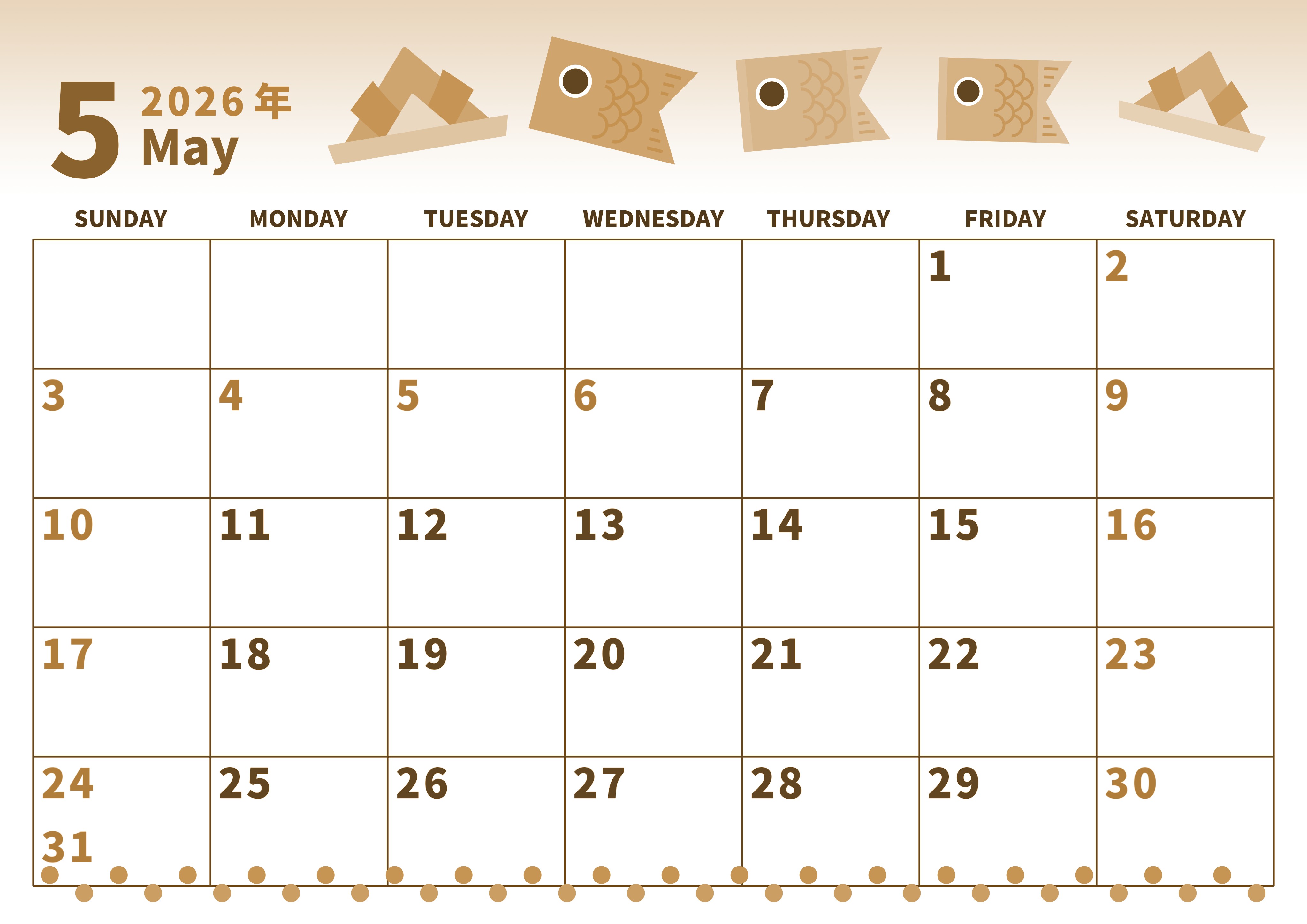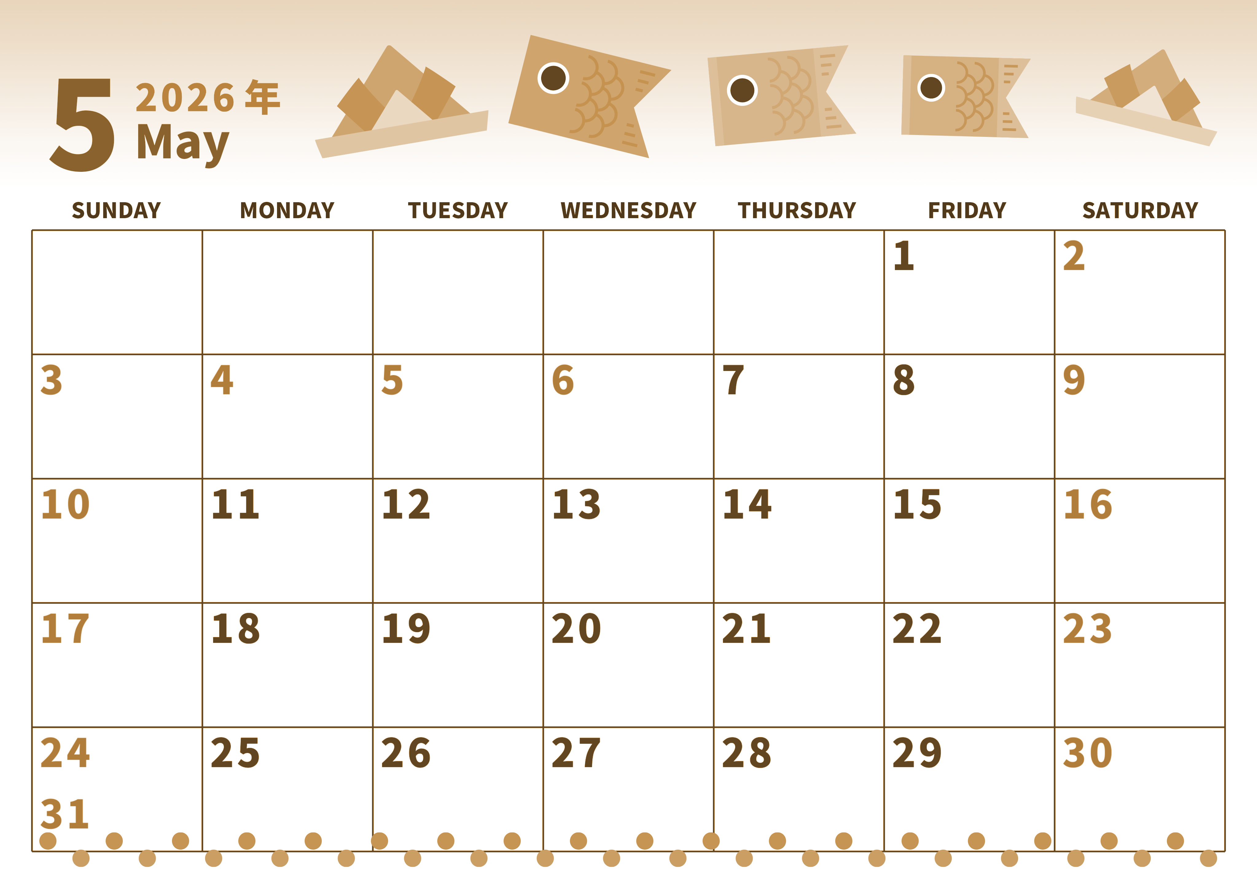 2026年5月横型レトロな日曜始まりの無料テンプレートセピア調カレンダーです。折り紙で作られた鯉のぼりや兜がかわいいイラストセピア調カレンダーです。澄んだ改正を連想させるデザインなので前向きになれます。(2026-00530500)