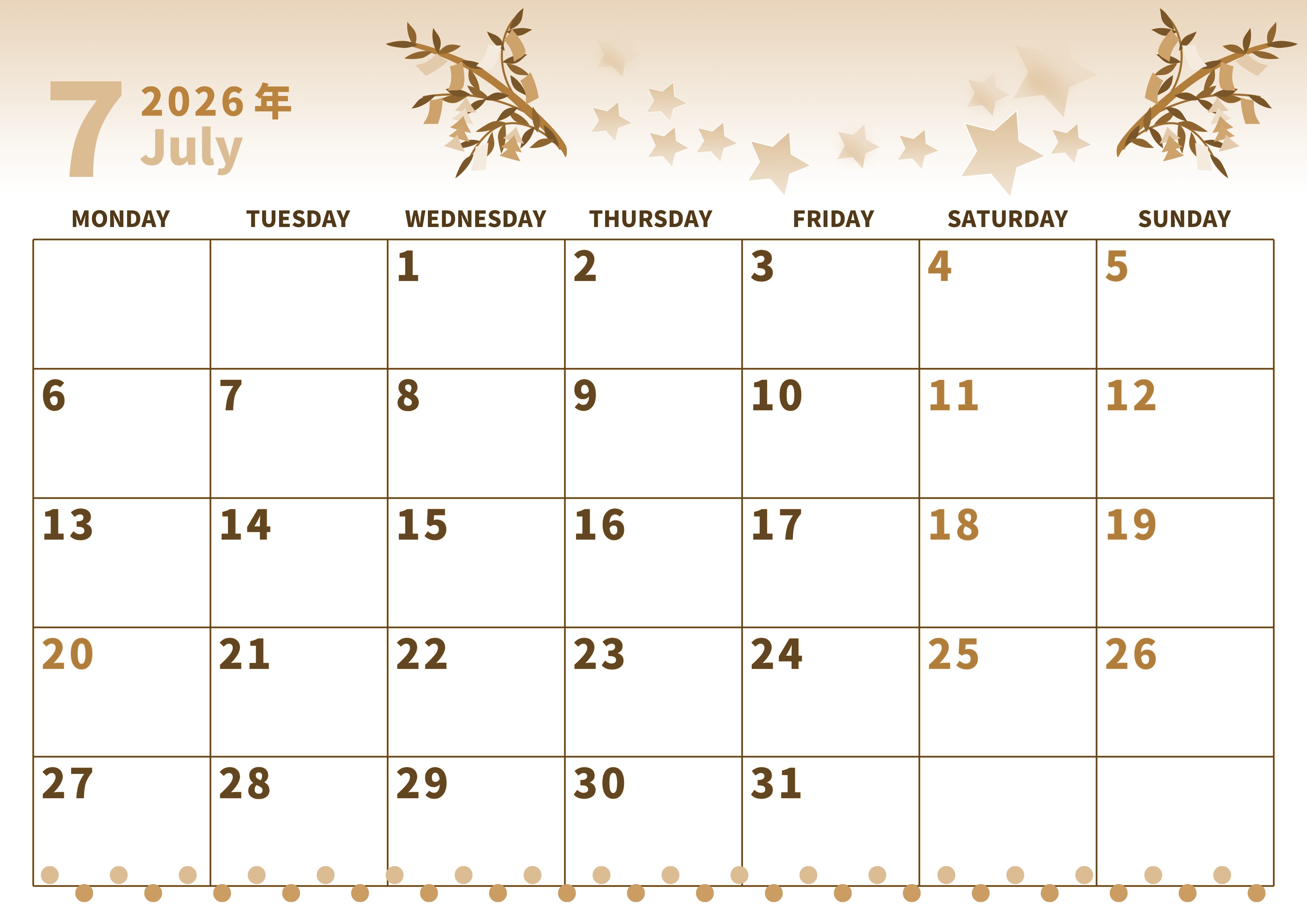 2026年7月横型レトロな月曜始まりの無料テンプレートセピア調カレンダーです。月曜始まりで七夕のイラストがかわいい実用性が高いだけでなくデザイン性も高いバランス感覚に優れている無料のセピア調カレンダーです。(2026-00530701)