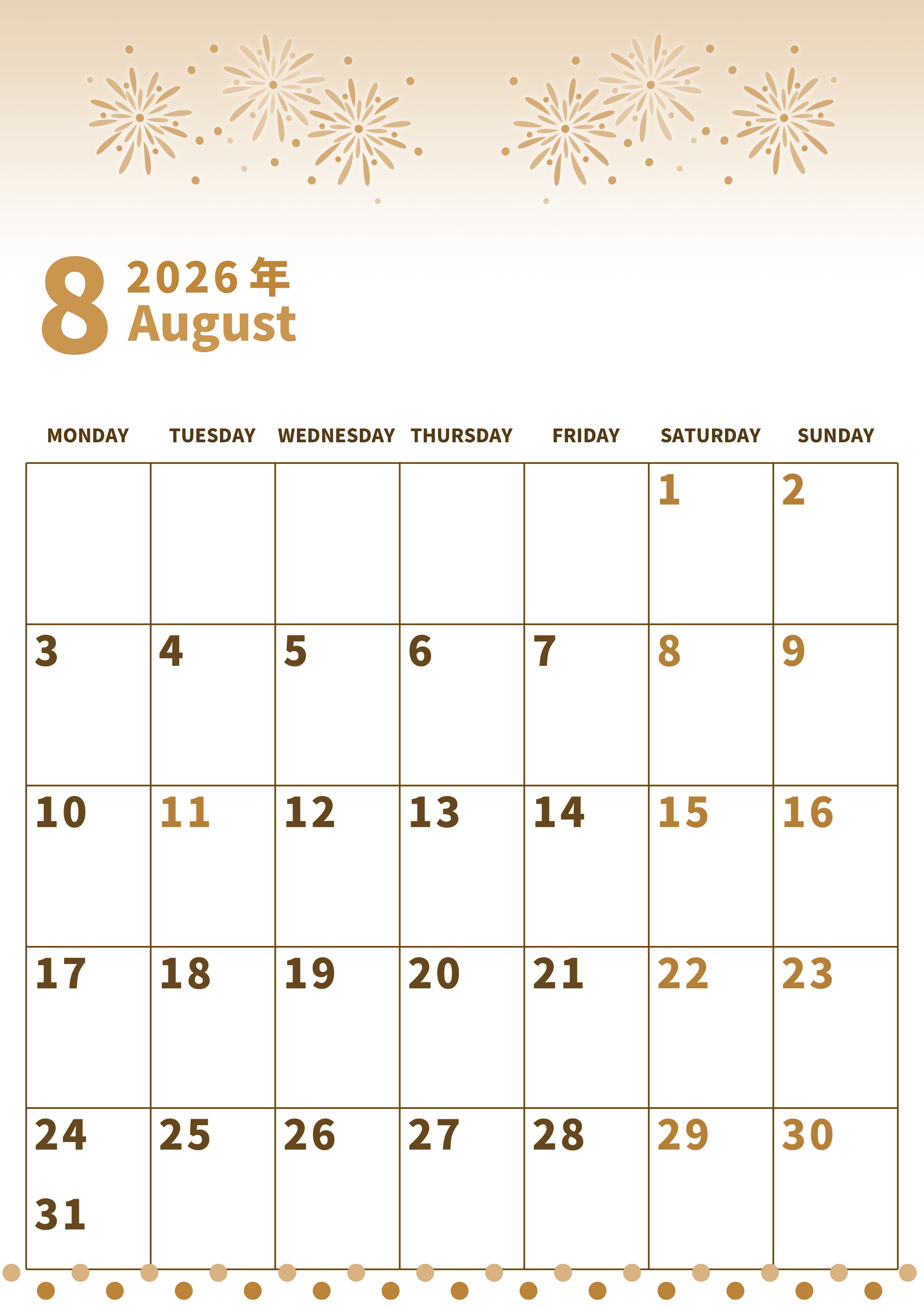 2026年8月縦型レトロな月曜始まりの無料テンプレートセピア調カレンダーです。素朴で上品に打ち上がっている花火のイラストが夏の終わりを感じさせる風情あるかわいいデザインの月曜始まりA4無料セピア調カレンダーとなっています。(2026-00530811)