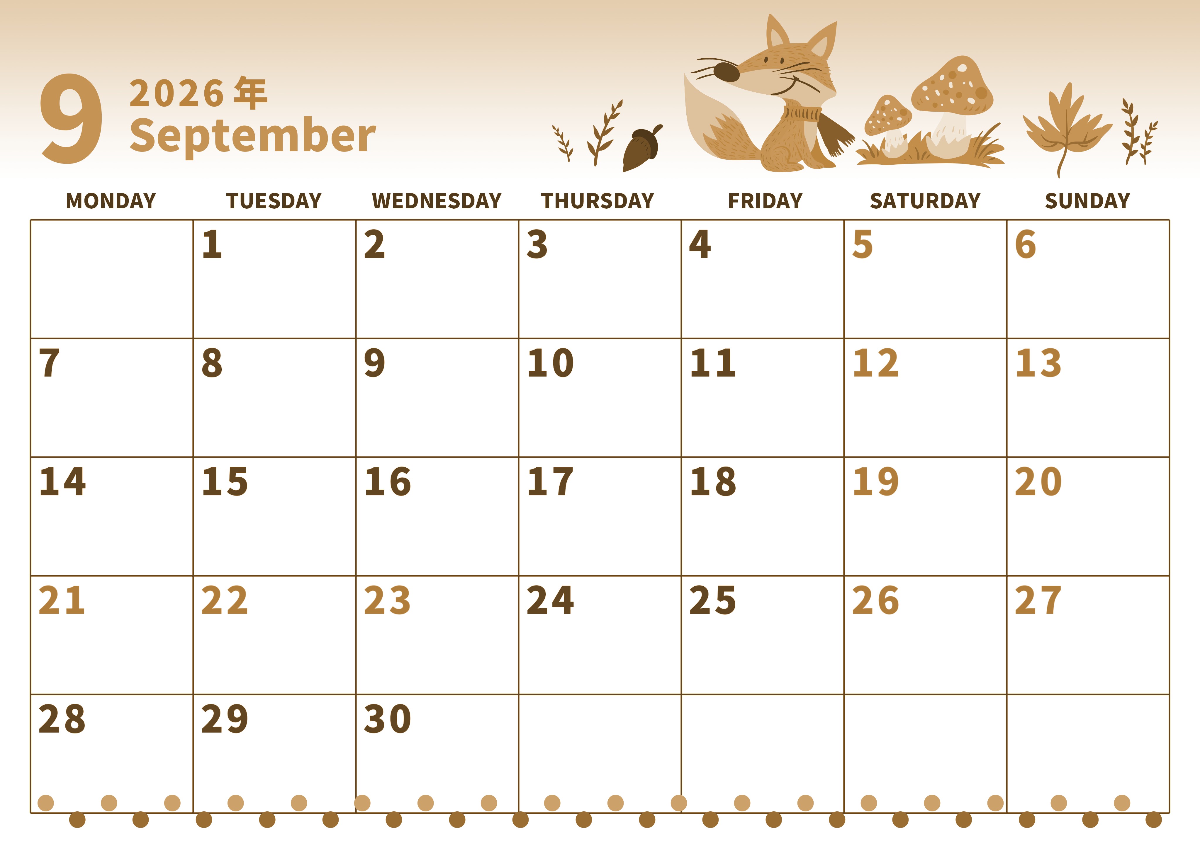 2026年9月横型レトロな月曜始まり キツネのイラストがかわいいA4無料セピア調カレンダー(2026-00530901)