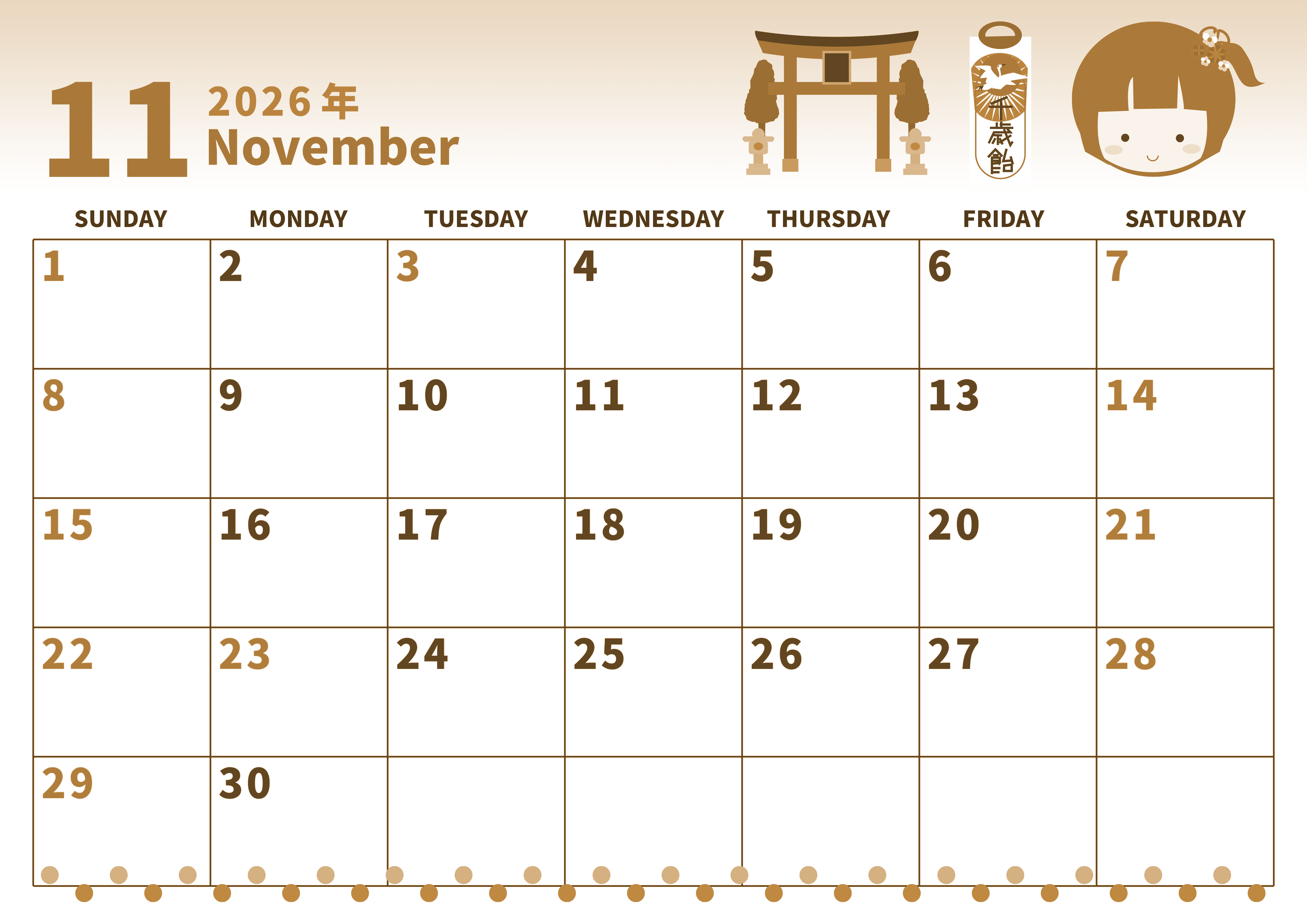 2026年11月横型レトロな日曜始まりの無料テンプレートセピア調カレンダーです。グラデーションを背景に女の子と千歳飴と鳥居のイラストがはっきりと描かれているかわいいセピア調カレンダーとなっています。(2026-00531100)