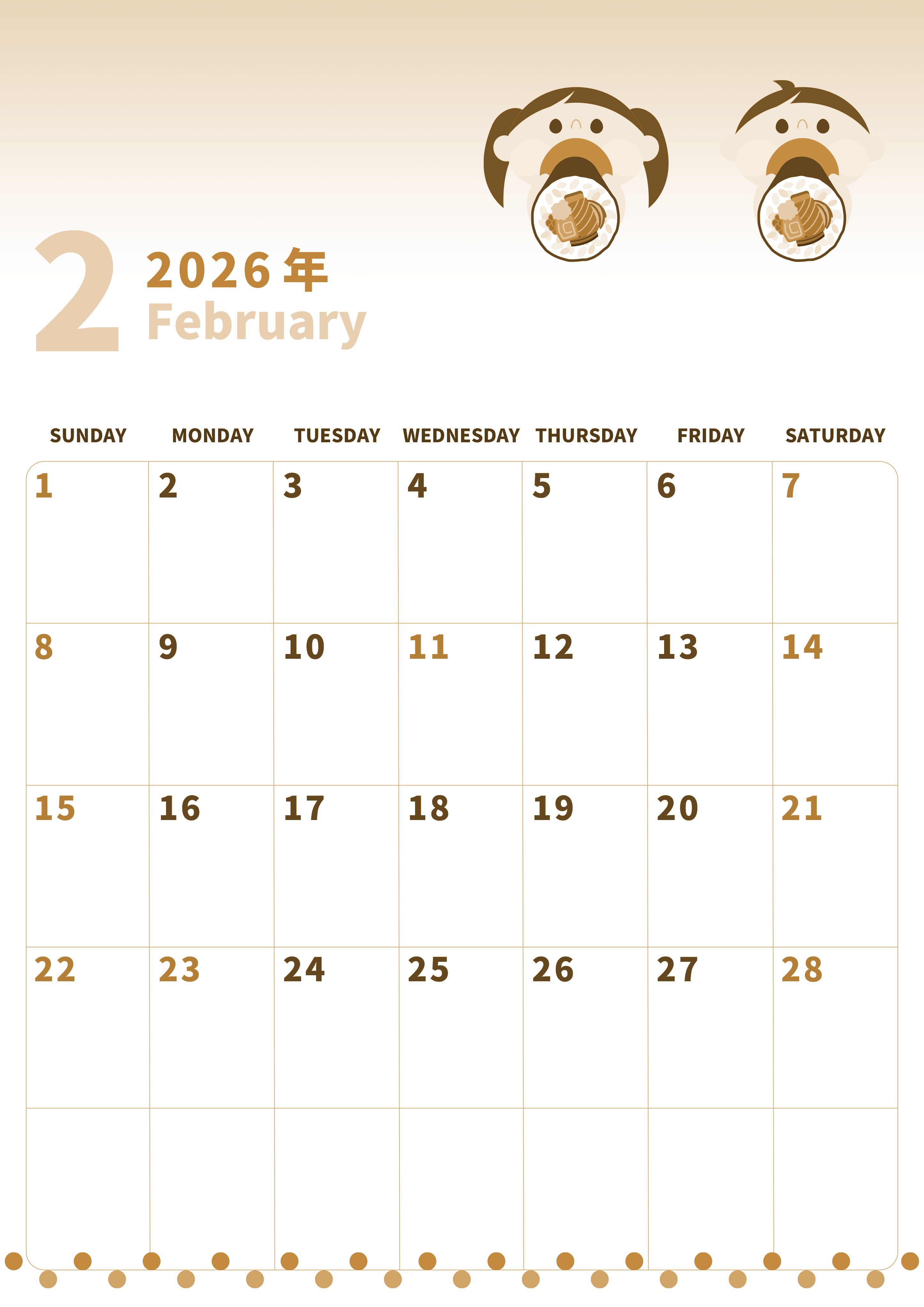 2026年2月縦型レトロな日曜始まりの無料テンプレートセピア調カレンダーです。縦型レトロなセピア調カレンダーなのでたっぷりと書き込めてタスク管理にピッタリです。イラストはかわいい子供たちのカップルです。(2026-00540210)