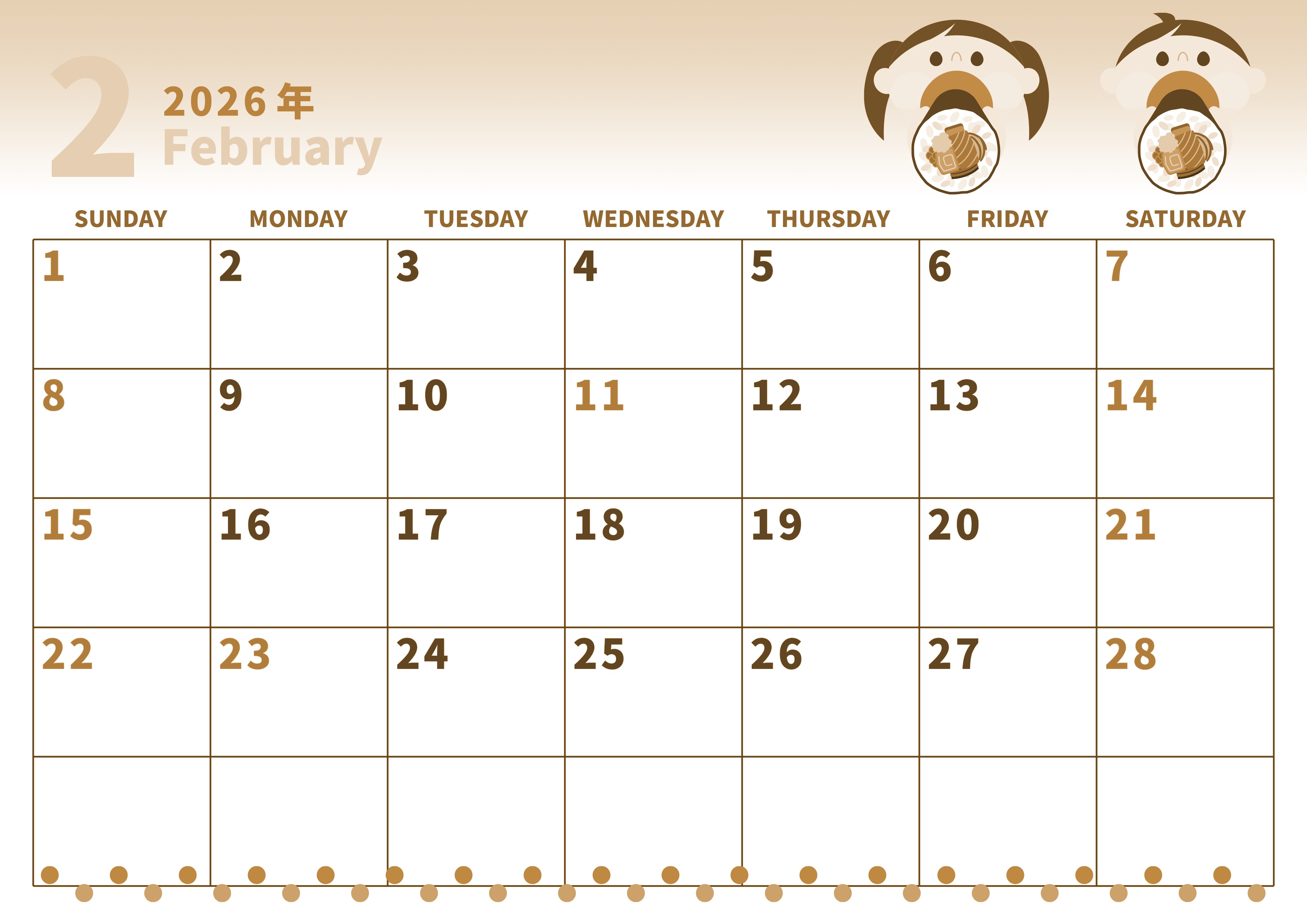 2026年2月横型レトロな日曜始まりの無料テンプレートセピア調カレンダーです。大きなお口をあんぐりと開けて恵方巻きを食べる男の子と女の子のかわいいイラスト付きセピア調カレンダーです。ふたりともおいしそうにむさぼっているデザインに癒されます。(2026-00540200)