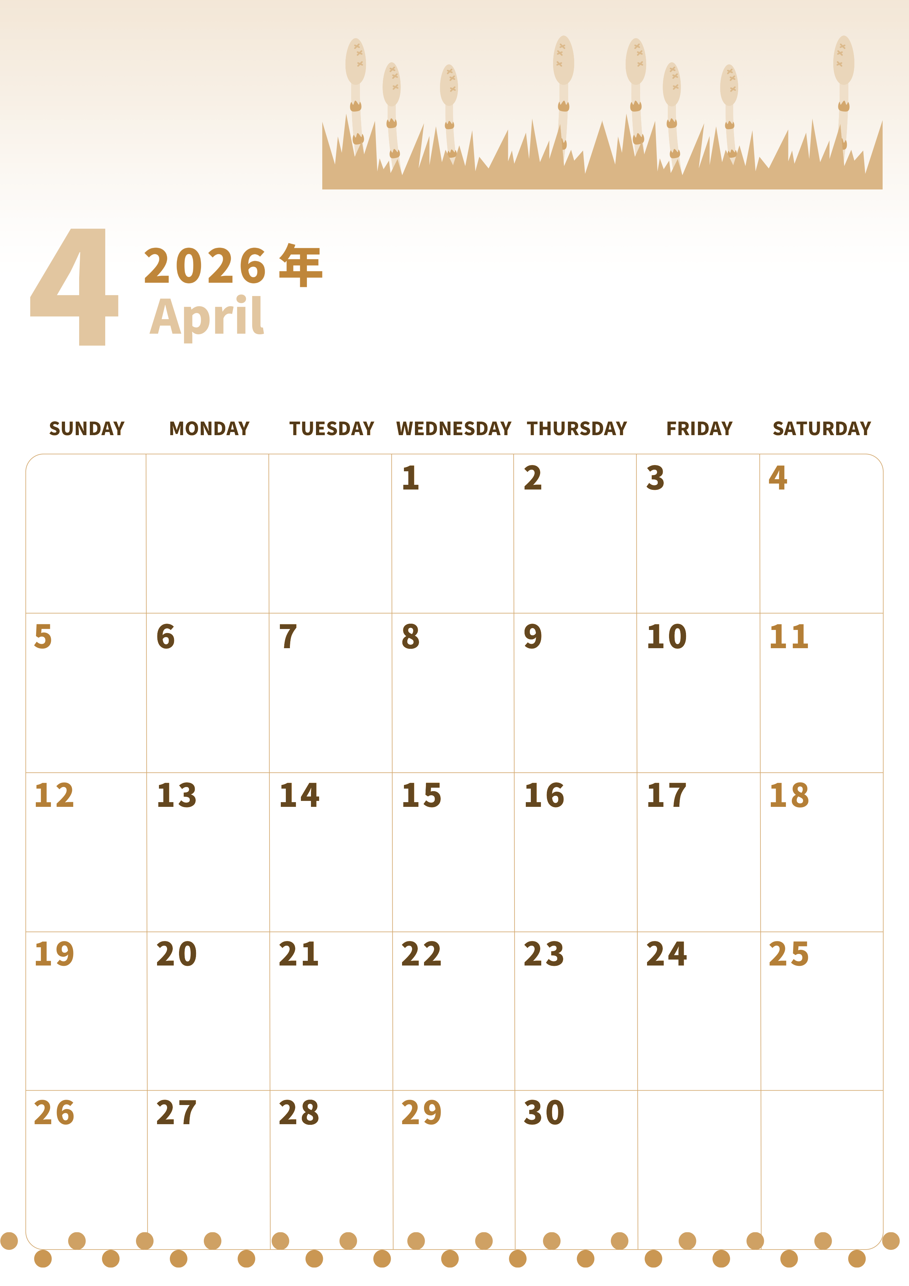 2026年4月縦型レトロな日曜始まりの無料テンプレートセピア調カレンダーです。たくさんのつくしが寄り集まっているイラストがかわいいA4で縦向きのセピア調カレンダーテンプレートです。罫線があるので予定を俯瞰して見やすいです。(2026-00540410)