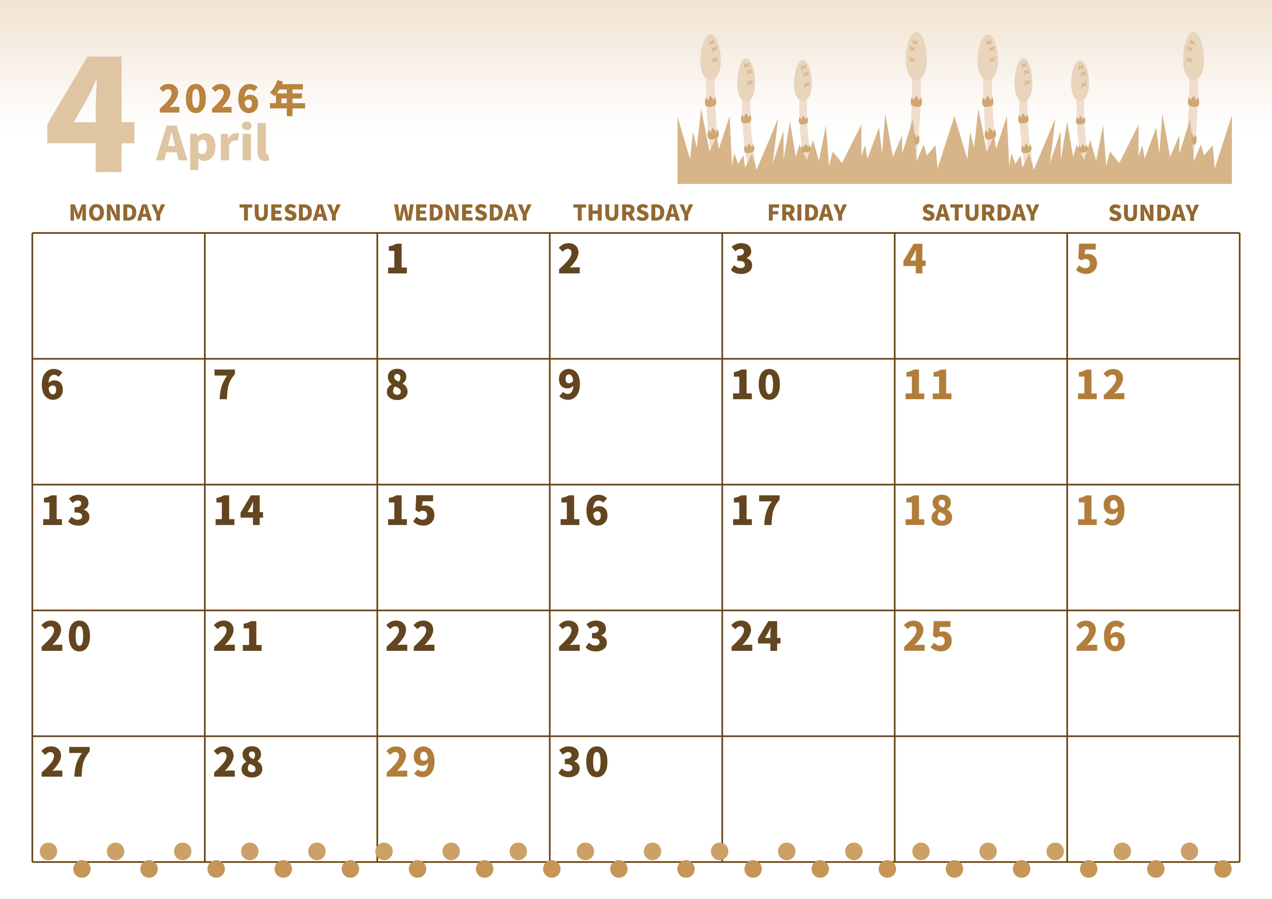 2026年4月横型レトロな月曜始まりの無料テンプレートセピア調カレンダーです。細くか弱いつくしが並んでいる様子がかわいいイラスト付きの月曜始まりセピア調カレンダーフォーマットです。家族の予定を把握するのにも適している素材です。(2026-00540401)