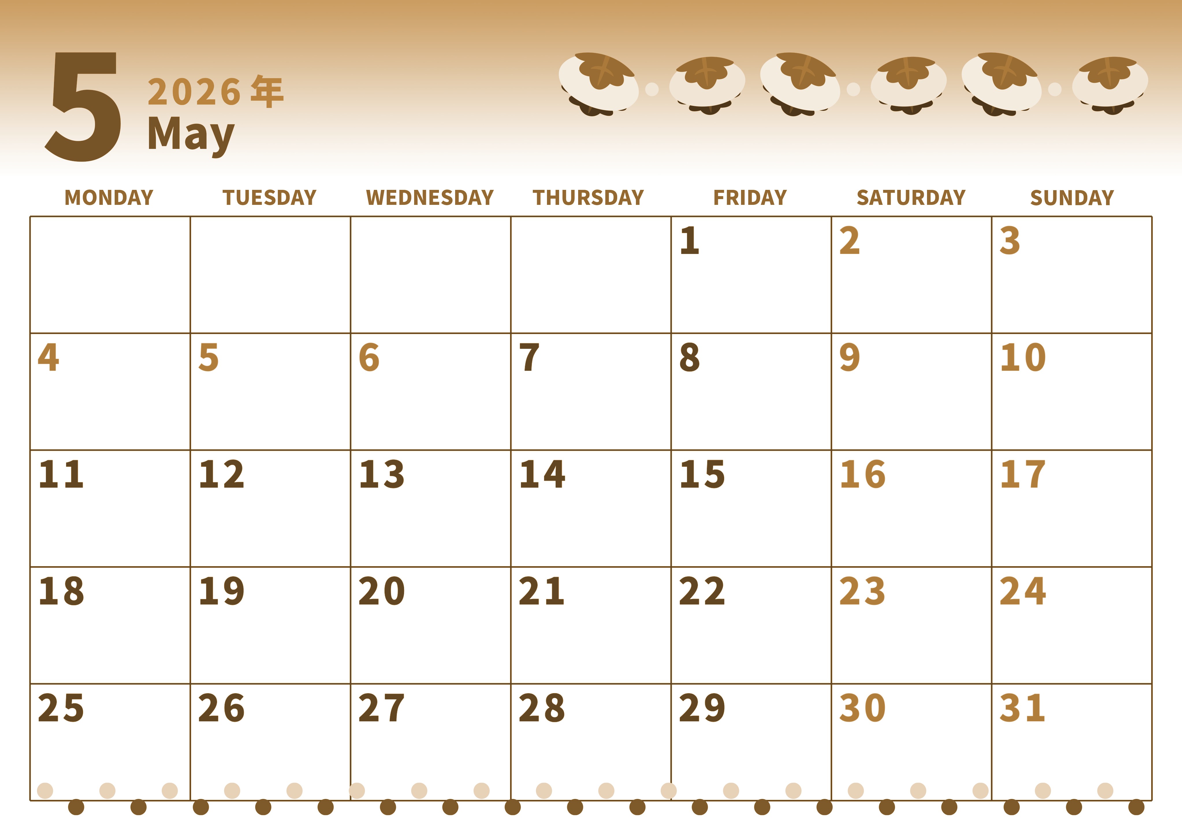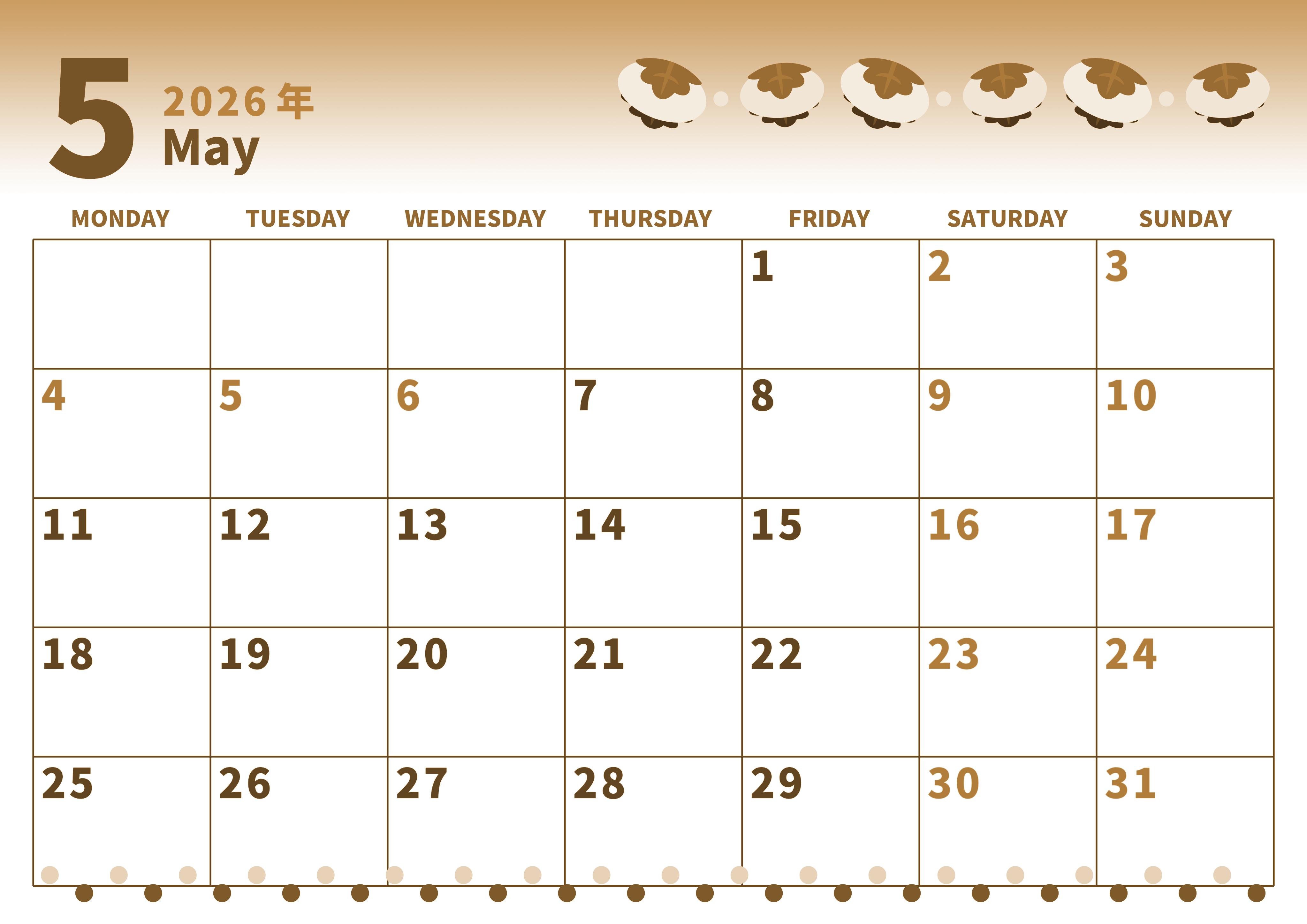 2026年5月横型レトロな月曜始まりの無料テンプレートセピア調カレンダーです。月曜始まりで枠もみやすくはっきりしている予定の書き込みがしやすい柏餅のイラストがコロコロしていてかわいいセピア調カレンダーです。曜日ごとに文字が色分けされています。(2026-00540501)