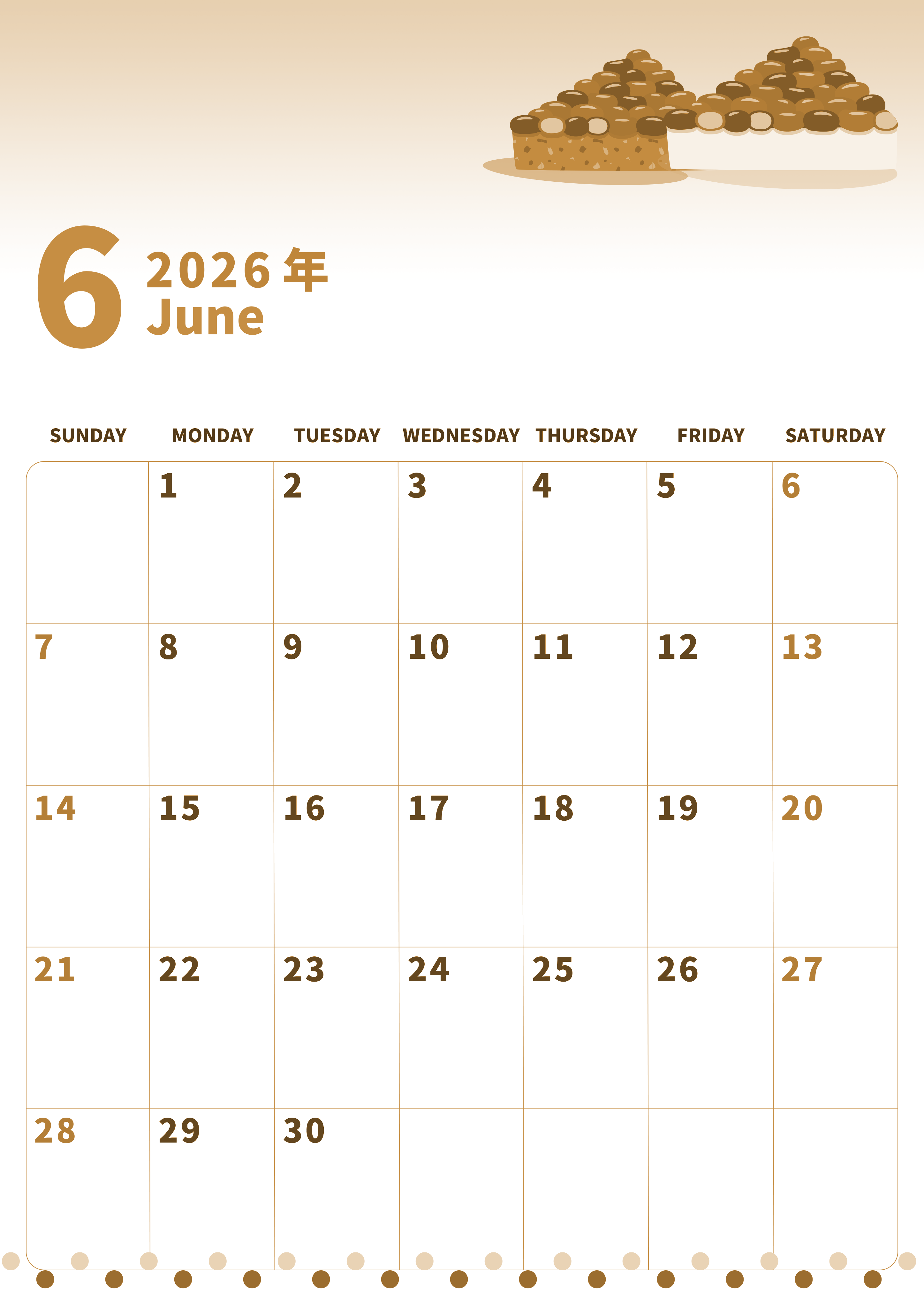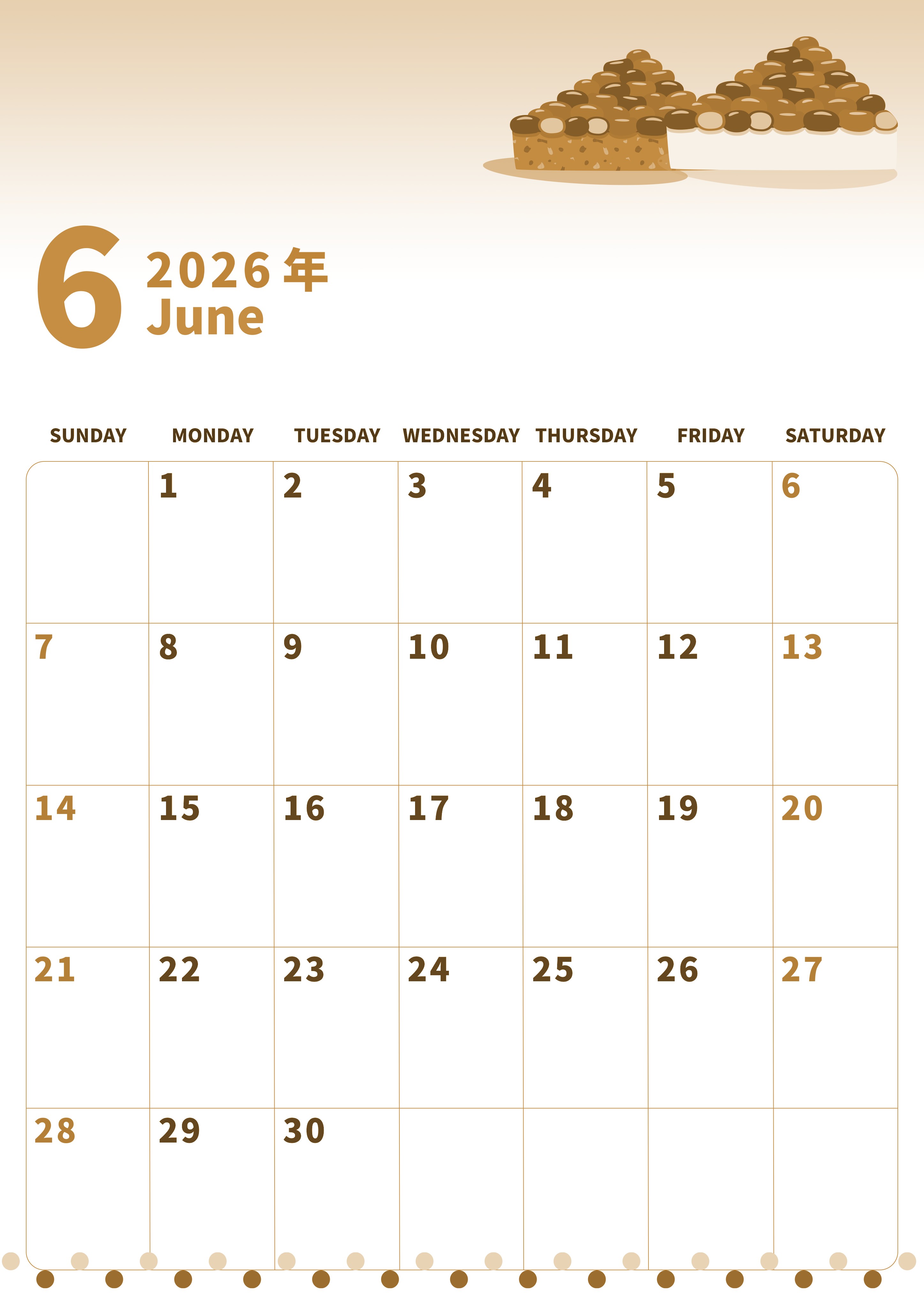 2026年6月縦型レトロな日曜始まりの無料テンプレートセピア調カレンダーです。水無月のイラストがかわいいです。セピア調カレンダー部分は白い余白が大きめなのでパッと見てタスク管理をしやすいレイアウトです。(2026-00540610)