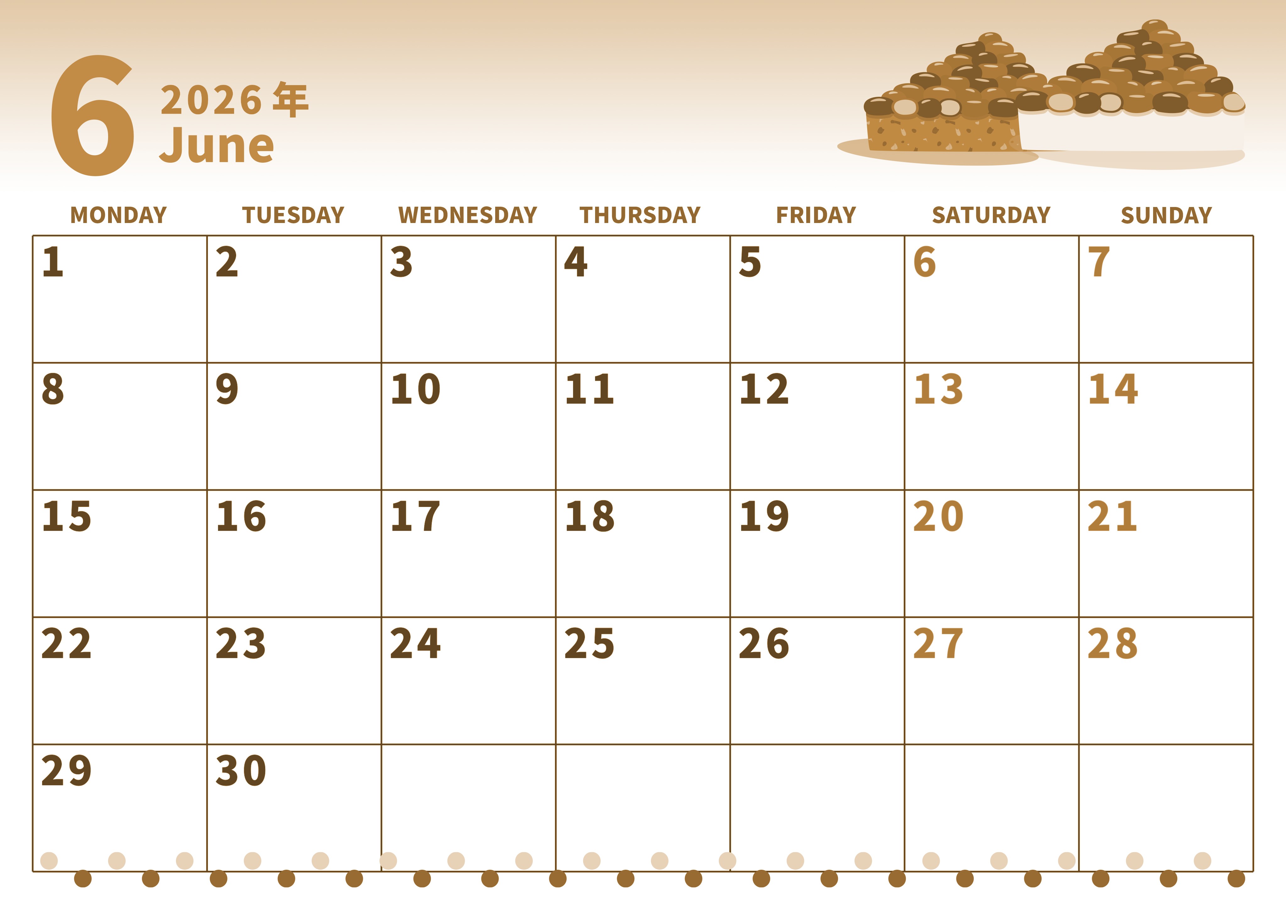 2026年6月横型レトロな月曜始まりの無料テンプレートセピア調カレンダーです。月曜始まりのセピア調カレンダーを使い慣れているという人に無料でダウンロードしてほしい水無月のイラストがかわいい使いやすいフリーフォーマットです。(2026-00540601)