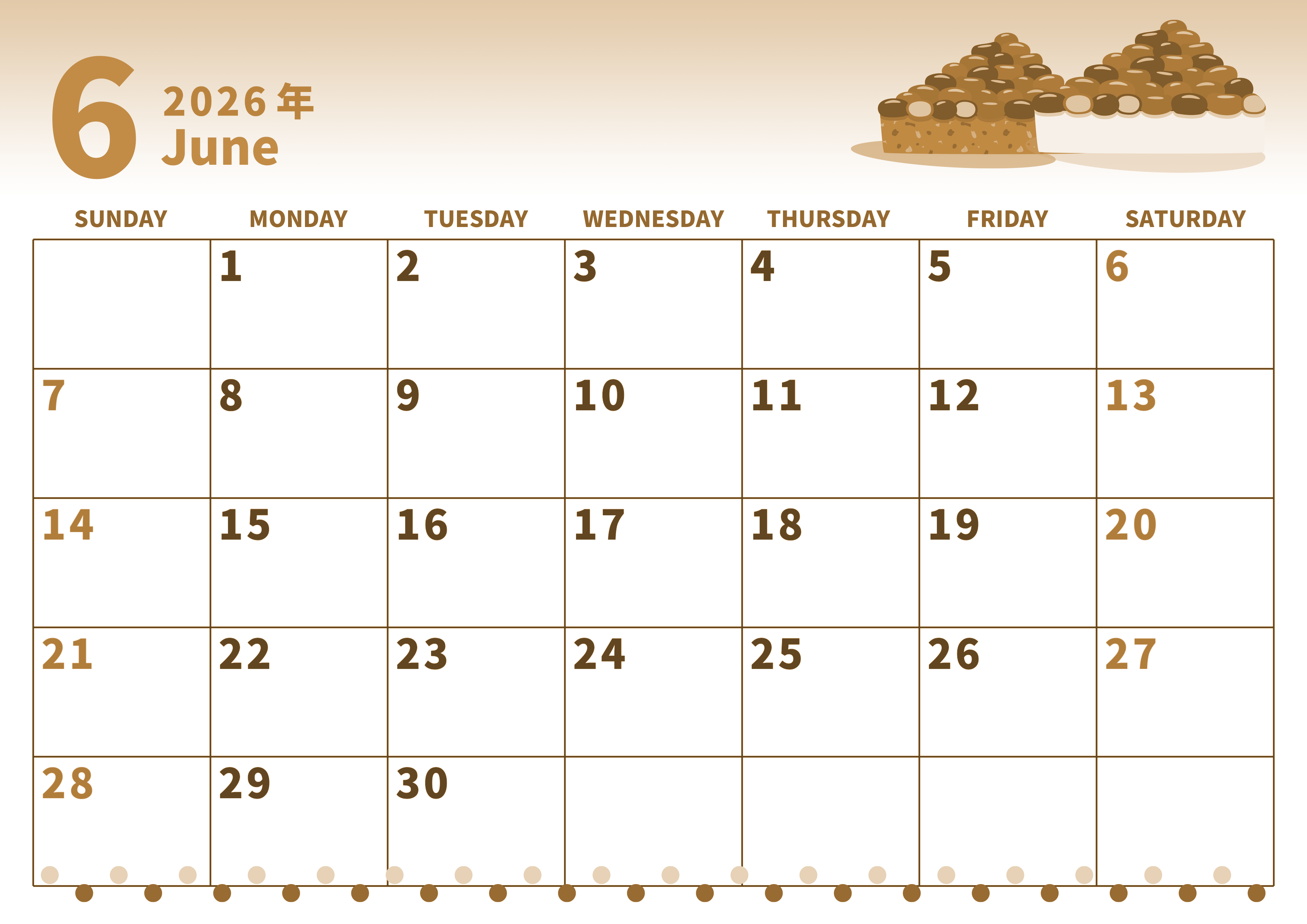2026年6月横型レトロな日曜始まりの無料テンプレートセピア調カレンダーです。6月を代表する和風スイーツであるあんこがたっぷりの水無月がおいしそうでかわいいイラストです。行事を把握しやすいレイアウトのセピア調カレンダーです。(2026-00540600)