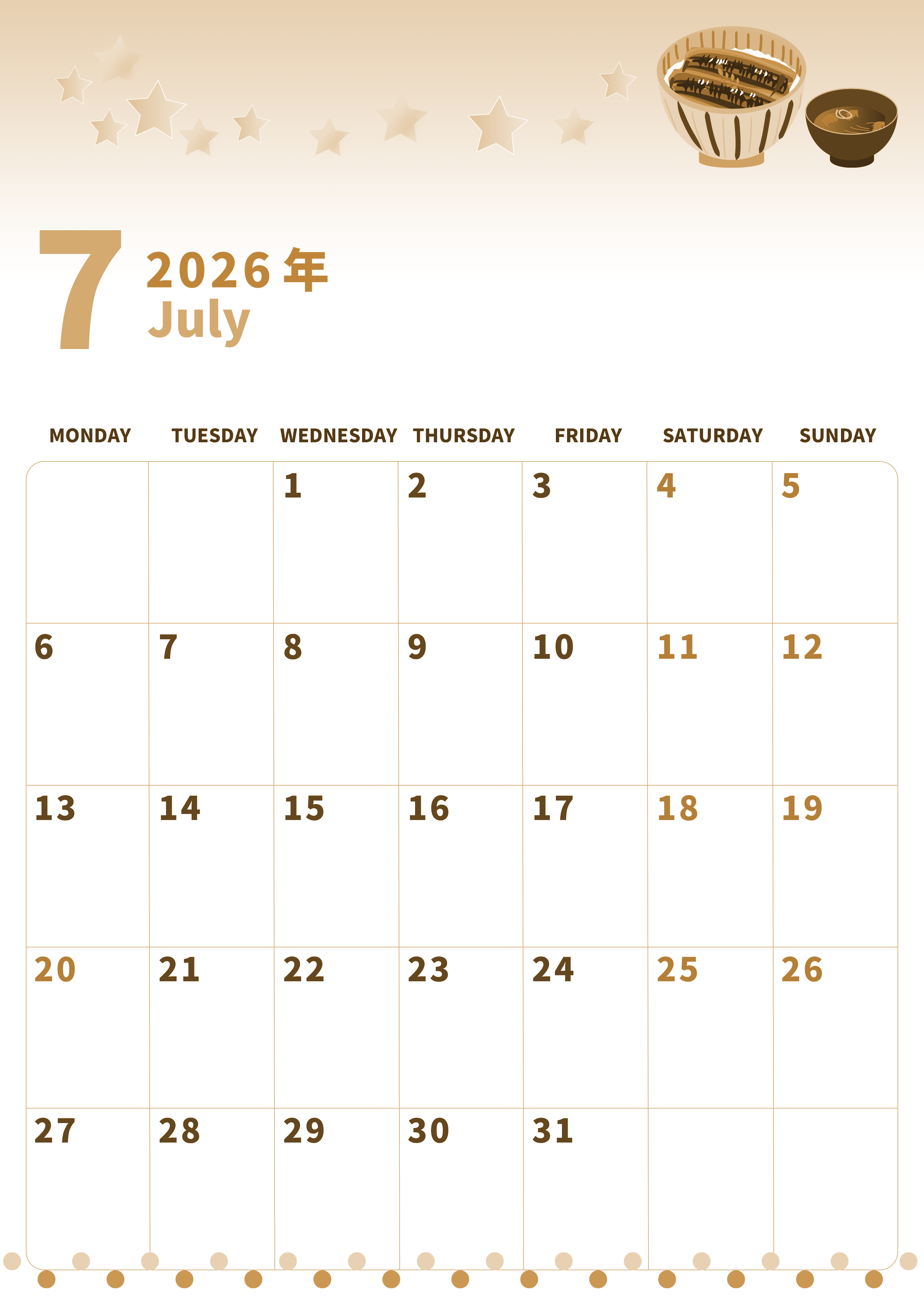 2026年7月縦型レトロな月曜始まりの無料テンプレートセピア調カレンダーです。月曜始まりで家族やカップルで使うのに適している見やすいフォーマットのセピア調カレンダーで土用をモチーフにしたイラストがかわいいポイントになっています。(2026-00540711)