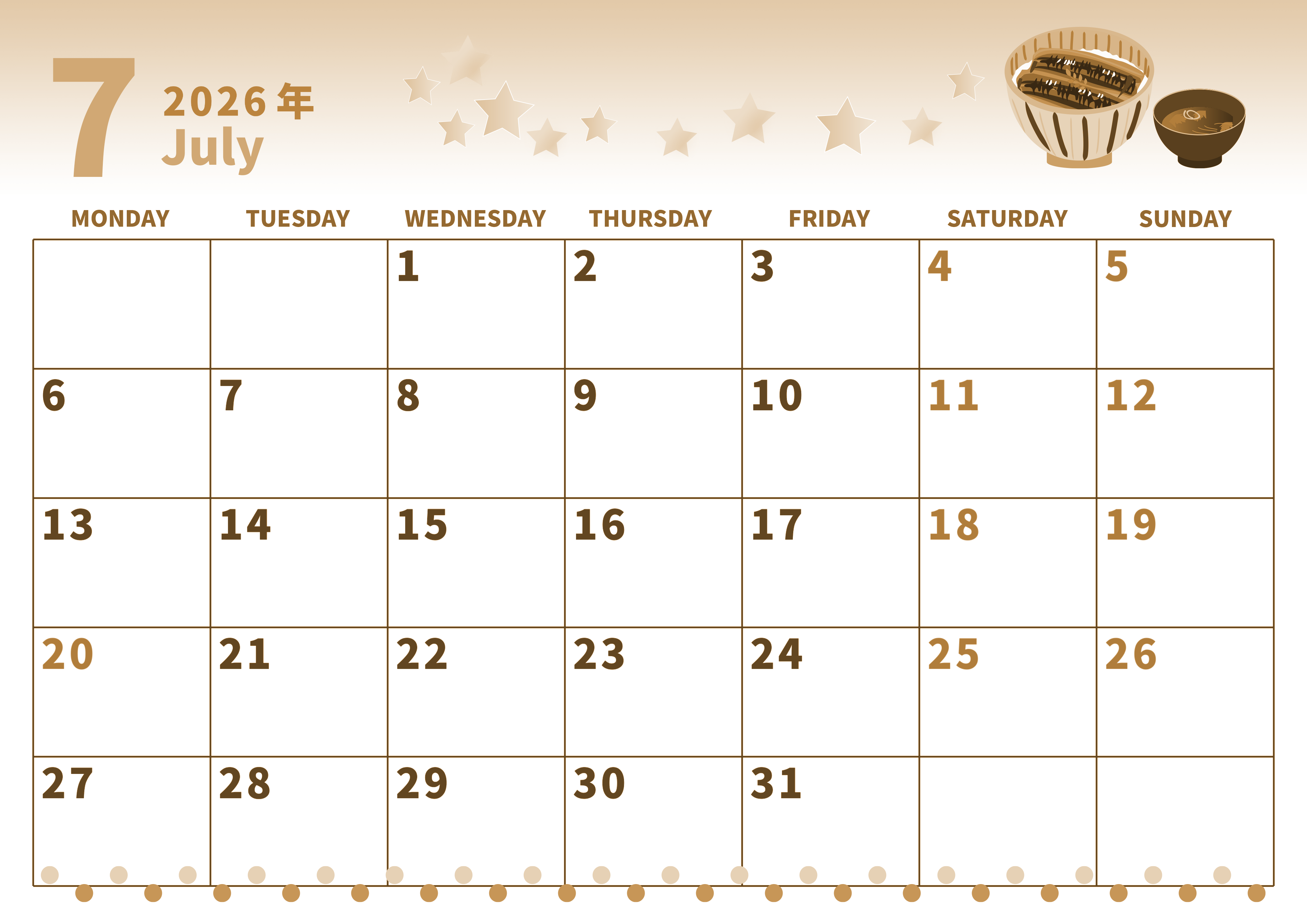 2026年7月横型レトロな月曜始まりの無料テンプレートセピア調カレンダーです。土用をテーマにしているイラストが温かそうでかわいい雰囲気のセピア調カレンダーです。月曜始まりで曜日毎に数字の色分けがなされているので便利です。(2026-00540701)